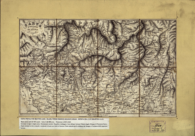 CARTA POSTALE DEI 4 LAGHI - MILANO, PRESSO DOMENICO MOLINARI LIBRAIO. DEPOSTA NEL L' I.R. BIBLIOTECA (s.d.).