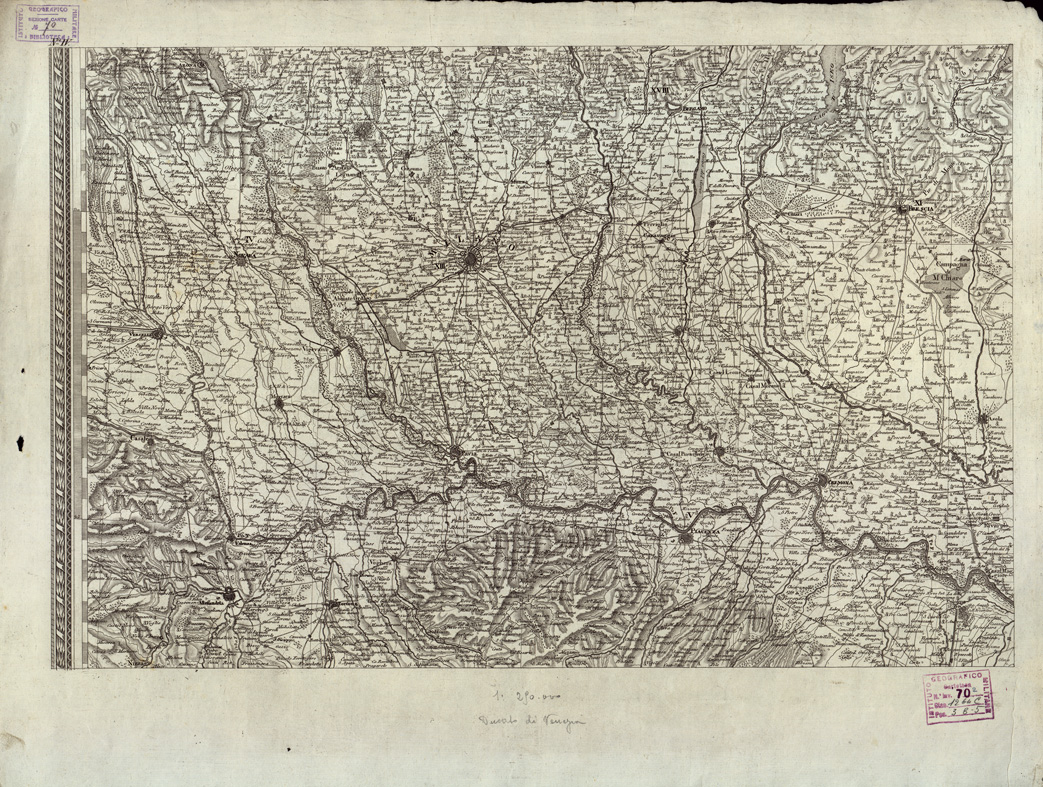 "...E TOSCANA A FIRENZE CON LA PARTE DEI PAESI CONFINANTI DEL PIEMONTE, SVIZZERA, GRIGIONI,TIROLO, CARINTIA E ISTRIA. DESUNTA DA MIGLIORI ORIGINALI. PER LO STATO VENETO DALLA CARTA LEVATA ASTRONOMICAMENTE E TRIGONOMETRICAMENTE DA TENENTE MARESCIALLO BARONE DE ZACH PER ORDINE DI SUA MAESTA' IMPERIALE REALE APOSTOLICA, ECC., ECC., E PER IL MANTOVANO E MILANESE DALLA CARTA LEVATA DAGLI ASTRONOMI DELL'OSSERVATORIO DI BRERA E IL RIMANENTE DA RIZZI ZANNONI (sic) ED ALTRI. DISEGNATA DA G. A. F. PINETTI INGEGNERE (sic) DATA ALLA LUCE E VENDIBILE A VIENNA PRESSO ARTARIA ET COMPAGNI PROPRIETA' DEGLI EDITORI C.P.S.C.M. A MILANO PRESSO FERD.ARTARIA DEPOSTA ALLA BIBLIOTECA REALE A MANNHEIM DOM. ARTARIA (s.d.). La carta si compone di nove fogli tratti da incisione su rame, stampati in nero, con orografia dimostrata a mezzo di tratteggio a luce zenitale. E'assai nitida e ricca di dati. Gli abitati principali sono rappresentati schematicamente in pianta : i secondari con torri e case e con circolini. Sono distinte le capitali, i capoluoghi, le città aperte, le città grandi, fortezze, castelli, città piccole e borghi, ville, terre e case, le stazioni di posta sono inoltre indicati ponti, traghetti, porti, paludi, risaie, boschi, ecc., Le starde sono classificate in postali, comuni, sentieri : esse recano le indicazioni delle distanze calcolate in poste. Sono tracciati i confini statali. Il foglio N°1 contiene il titolo in tedesco il foglio N° IV il titolo in italiano il foglio N° 7 la leggenda dei segni convenzionali con spiegazioni in italiano e in tedesco e le scale grafiche calcolate in leghe comuni di Francia, miglia italiane, tedesche, in miriametri e in leghe austriache. Annesso un quadro di unione e una cartina supplemento di Torino e dintorni. La carta comprende il territorio limitato a nord a Brixen, sud Firenze, ovest Vercelli, est Trieste."