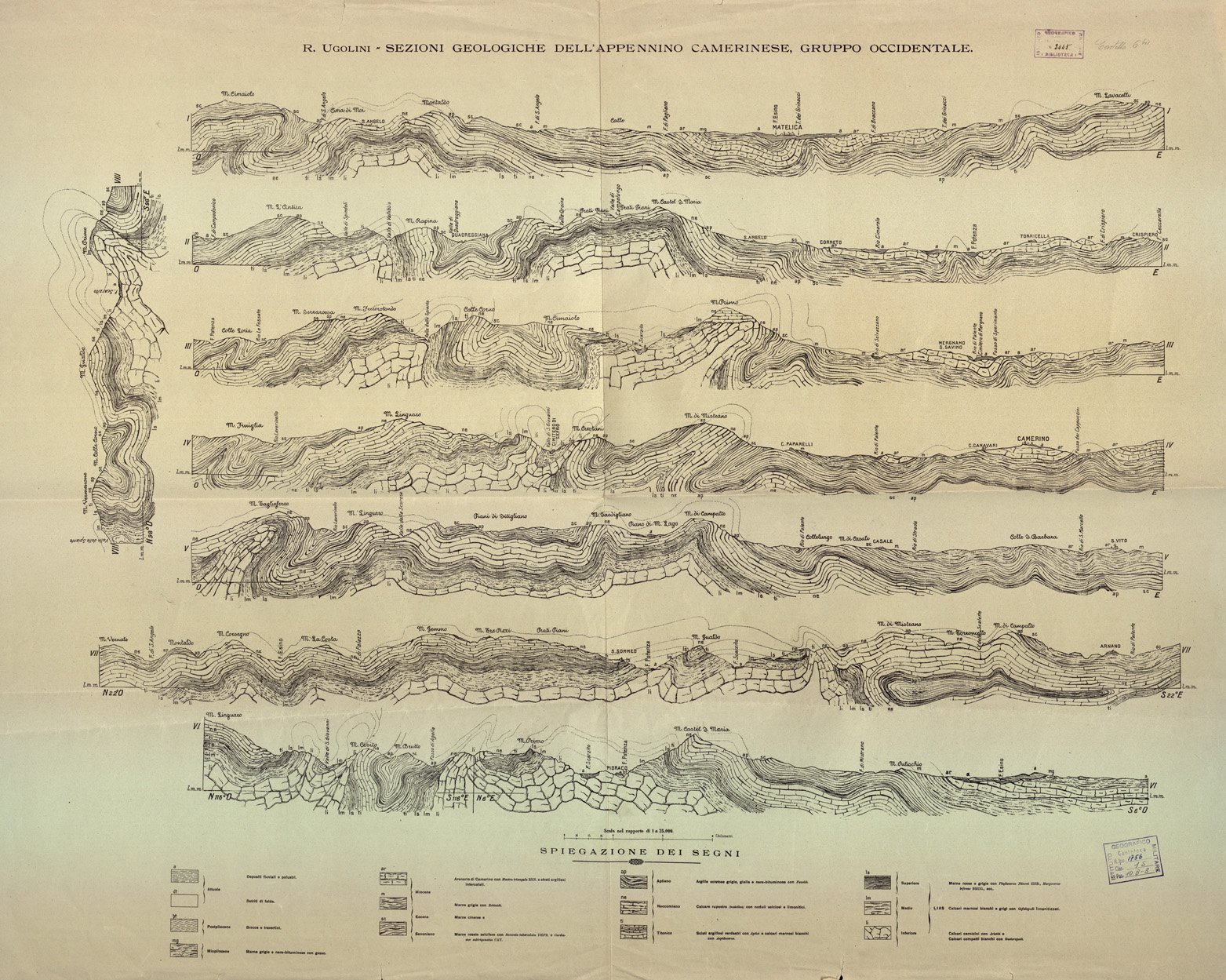 "Questo documento è composto da: CARTA LITOEROMETRICA DELL'APPENNINO CAMERINESE (File B0003990) CARTA MORFOTETTONICA DELL'APPENNINO CAMERINESE (File B0003989) R. UGOLINI - SEZIONI GEOLOGICHE DELL'APPENNINO CAMERINESE (FILE B0003987). Due fogli a colori con orografia a curve di livello tracciate in bistro alla equidistanza di 50 metri. In basso spiegazione dei colori. Annesso un foglio in nero delle dimensioni di m. 0,82x1,03 con le " Sezioni Geologiche dell'Appennino Camerinese", gruppo occidentale,alla scala di 1:25.000."