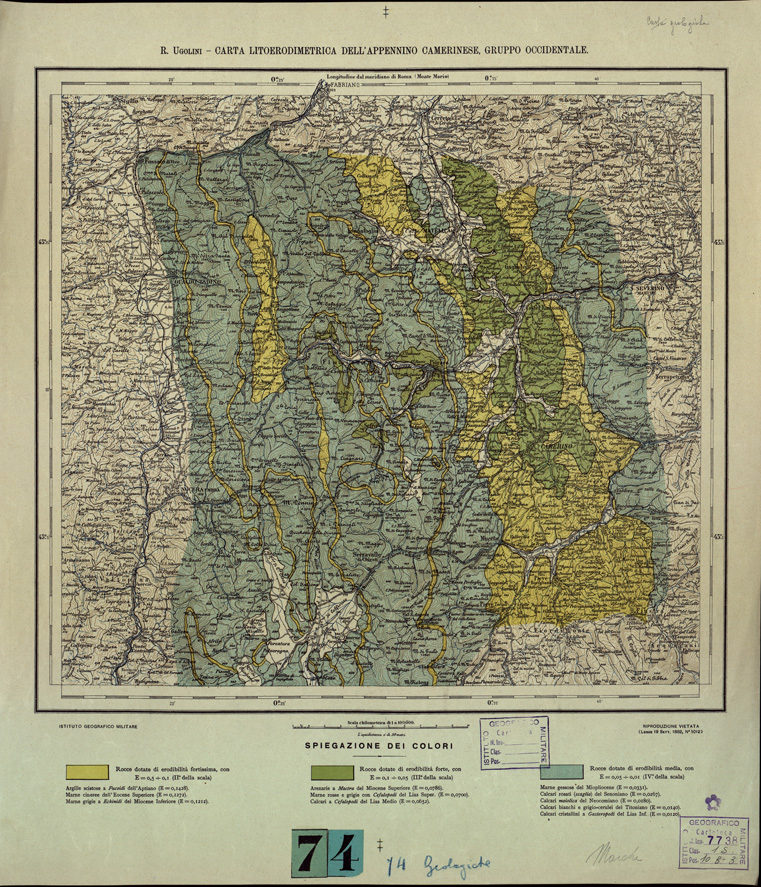 "Questo documento è composto da: CARTA LITOEROMETRICA DELL'APPENNINO CAMERINESE (File B0003990) CARTA MORFOTETTONICA DELL'APPENNINO CAMERINESE (File B0003989) R. UGOLINI - SEZIONI GEOLOGICHE DELL'APPENNINO CAMERINESE (FILE B0003987). Due fogli a colori con orografia a curve di livello tracciate in bistro alla equidistanza di 50 metri. In basso spiegazione dei colori. Annesso un foglio in nero delle dimensioni di m. 0,82x1,03 con le " Sezioni Geologiche dell'Appennino Camerinese", gruppo occidentale,alla scala di 1:25.000."