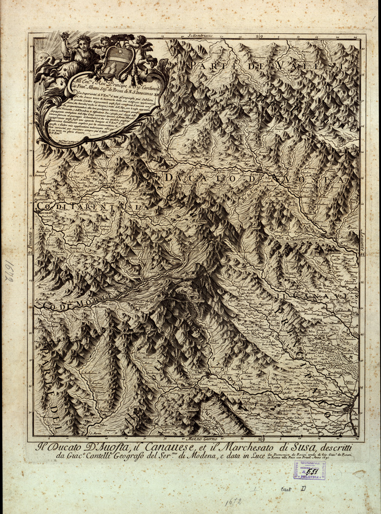 " SPETTANTE ALLA CASA REALE DI SAVOIA,RIMANENDO L'ALTRA PARTE AL SERENISS.MO DI MANTOVA il tutto descritto da Giacomo Cantelli Geografo del Sereniss.mo S.r Duca di Modena, e dato in luce da Domenico De Rossi, ecc. Questa carta è una copia di quella descritta nel catalogo ragionato alla pagina 78,numero di ordine 8, N.38 Collezione Bianconi. L'unica differenza con quella carta è che questa è costituita da 4 spezzoni separati. Nel Catalogo ragionato essa viene così descritta : " Carta in quattro fogli riuniti su tela, facente parte del "Mercurio Geografico " edito in Roma dal Rossi. Orografia prospettica I boschi sono indicati con alberetti. E' tracciata la rete stradale. Centri abitati principali rappresentati schematicamente secondo la loro pianta. Sono distinti gli arcivescovadi,i vescovadi, i feudi imperiali e quelli della Chiesa. Limiti: nord, Orsiere sud, Antibo est,Campione ovest,Roncat. In alto a sinistra la dedica al Card. G. Fr. Albani. A sinistra le scale grafiche in misurta antiche."