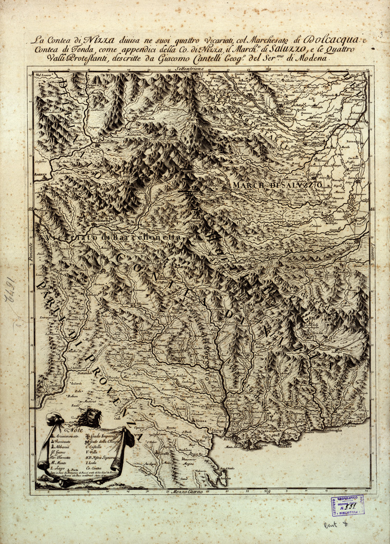 "SPETTANTE ALLA CASA REALE DI SAVOIA,RIMANENDO L'ALTRA PARTE AL SERENISS.MO DI MANTOVA il tutto descritto da Giacomo Cantelli Geografo del Sereniss.mo S.r Duca di Modena, e dato in luce da Domenico De Rossi, ecc. Questa carta è una copia di quella descritta nel catalogo ragionato alla pagina 78,numero di ordine 8, N.38 Collezione Bianconi. L'unica differenza con quella carta è che questa è costituita da 4 spezzoni separati. Nel Catalogo ragionato essa viene così descritta : " Carta in quattro fogli riuniti su tela, facente parte del "Mercurio Geografico " edito in Roma dal Rossi. Orografia prospettica I boschi sono indicati con alberetti. E' tracciata la rete stradale. Centri abitati principali rappresentati schematicamente secondo la loro pianta. Sono distinti gli arcivescovadi,i vescovadi, i feudi imperiali e quelli della Chiesa. Limiti: nord, Orsiere sud, Antibo est,Campione ovest,Roncat. In alto a sinistra la dedica al Card. G. Fr. Albani. A sinistra le scale grafiche in misurta antiche."