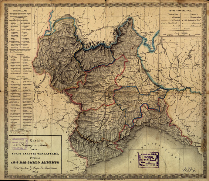 "...DEDICATA A S. S. R. M. CARLO ALBERTO. DAL CAPITANO G. LUIGI DE BARTOLOMEI, TORINO PRESSO L'EDITORE GIO. BATTA MAGGI. Un foglio stampato in nero con confini a colori e orografia dimostrata a mezzo di tratteggio a luce obliqua. La carta distingue gli abitati in base alla loro importanza amministrativa le strade reali, provinciali, comunali, sentieri, i passaggi alpini, i confini di stato, di divisione di provincia. A sinistra un elenco dei passaggi alpini. "
