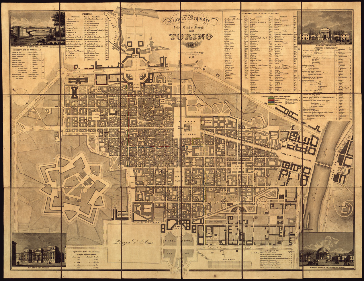 "Questa carta viene descritta alla pagina 150-151 del catalogo ragionato. Si tratta della copia acquisita come Collezione Regalia N.2. La carta viene così descritta : " Foglio unico stampato in nero, sussidiato da elenco numerico delle strade e degli edifici pubblici. Agli angoli vedute. (Vedi anche N.2 Collezione Regalia) : questa copia distingue a colori le quattro sezioni della città : Moncenisio, Dora, Monviso, Po."