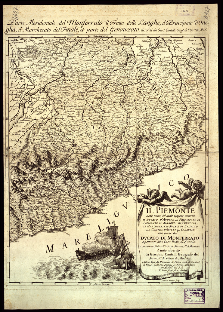 "...,IL PRINCIPATO DI PIEMONTE,LA SIGNORIA DI VERCELLI,LI MARCHESATI DI SUSA E DI SALUZZO,LA CONTEA D'ASTI ET IL CANAVESE CON PARTE DEL DUCATO DI MONFERRATO SPETTANTE ALLA CASA REALE DI SAVOIA,RIMANENDO L'ALTRA PARTE AL SERENISS.MO DI MANTOVA il tutto descritto da Giacomo Cantelli Geografo del Sereniss.mo S.r Duca di Modena,e data in luce da Domenico de Rossi,erede di Gio. Giacomo de Rossi alle sue stampe in Roma alla pace con primil.del S.P.L'anno 1691 die 25 ottobre con licenza de Sup.Antonio Barbey Sculp. Questa carta conservata in biblioteca è una copia parziale (sono le Tav.3 e 4 riunite in foglio unico e precisamente i file B0004110 e B0004112 già precedentemente descritti e facenti parte della stessa collezione) di quella Coll.Bianconi N.° 38 descritta nel Catalogo Ragionato alla pag. 78 Numero di ordine 8. Nel catalogo viene così descritta: "Carta in quattro fogli riuniti su tela,facente parte del "Mercurio Geografico"edito in Roma dal De Rossi.Orografia prospettica.I boschi sono indicati con alberetti.E' tracciata la rete stradale.Centri abitati principali rappresentati schematicamente secondo la loro pianta.Sono distinti gli Arcivescovadi,i vescovadi,i feudi imperiali e quelli della Chiesa. Limiti: nord,Orsiere sud,Antibo est,Campione ovest,Roncat. In alto a sinistra la dedica al Card. G. Fr. Albani. A sinistra le scale grafiche in misura antiche.""