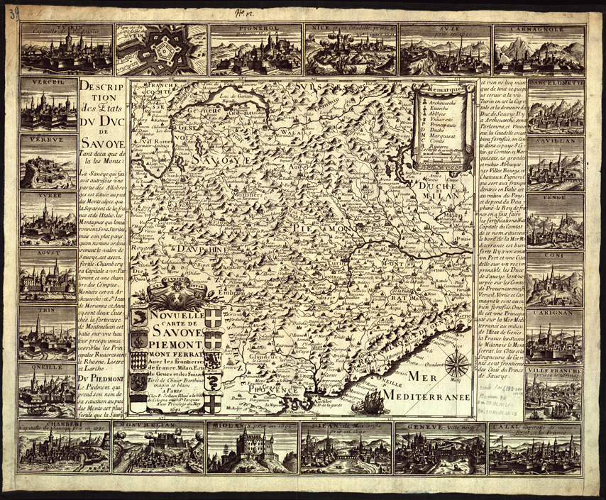 "...AVEC LES FRONTIERES DE FRANCE, MILAN, ESTAT DE GENES ET DES SUISSE, TIREE DE CLINIER BERTHIUS MAGIN ET BLEAU. A PARIS, CHEZ F. JOLLAIN L'AINE A LA VILLE DE COLOGNE, RUE S. JACQUES. AVEC PRIV. DU ROY. Incisione su rame in un sol foglio montato su tela. Si estende dalla franca contea alla Provenza al Ducato di Milano. Orografia prospettica a monticelli. Manca la rete stradale. Sono tracciate le linee dei confini politici. Centri abitati rappresentati schematicamente in prospettiva con distinzione degli arcivescovadi, vescovadi, ecc. Ai lati orientale e occidentale del campo disegnato due note descrittive della Savoia e del Piemonte. Attorno ai margini di vedute delle principali città. Due scale grafiche in miglia d'Italia e di Francia. (B2)"