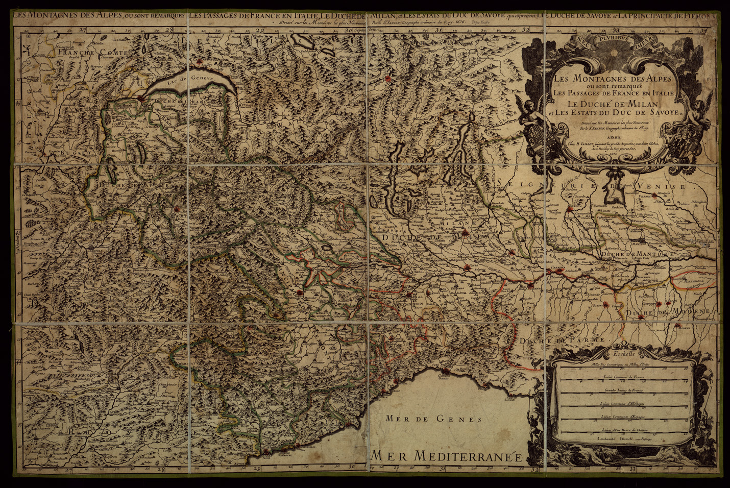 LES MONTAGNES DES ALPES OU SONT REMARQUES LES PASSAGES DE FRANCE EN ITALIE LE DUCHE DE MILAN ET LES ESTATS DU DUC DE SAVOYE. DRESSE SUR LES MEMOIRES LES PLUS NOUVEAUX PAR LE S. SANSON GEOGRAPHE ORDINAIRE DU ROY A PARIS CHEZ H. JAILLOT, ECC.