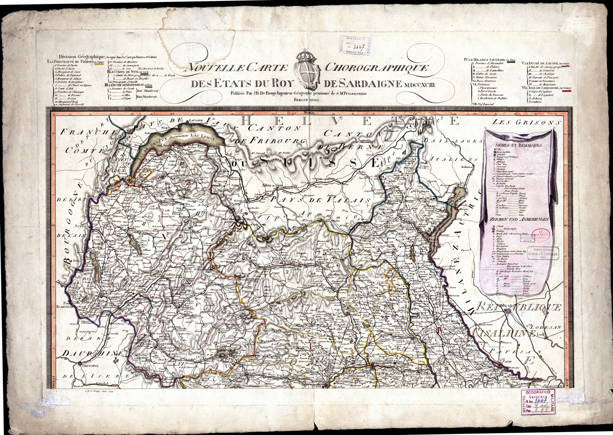 "...DU ROY DE SARDAIGNE MDCCXCIII. PUBLIEE PAR J. B. DE BOUGE INGENIEUR GEOGRAPHE PENSIONNE' DE S. M. PRUSSIENNE. BERLIN, 1800. La carta si compone di due fogli, ognuno delle dimensioni sotto indicate, tutti da incisione su rame. L'orografia vi è dimostrata schematicamente col tratteggio. I confini politici e amministrativi sono a colori. Sono distinte le città, le città fortificate, le cittadelle, i borghi e i villaggi maggiori, i villaggi minori, i capoluoghi e i conventi, castelli, sedi episcopali, stazioni postali, luoghi di battaglie, ecc.... Le strade sono distinte in tre classi: sono indicati anche i sentieri. Il foglio settentrionale reca in alto il titolo in francese e in tedesco. In basso a sinistra è scritto: "J. B. De Bouge Sculp 1799". Il foglio meridionale reca il titolo in tedesco: in basso a sinistra è una cartina supplementare per la Sardegna. La scala grafica è in miglia d'Italia. Le longitudini sono calcolate dal meridiano dell'Isola del Ferro."