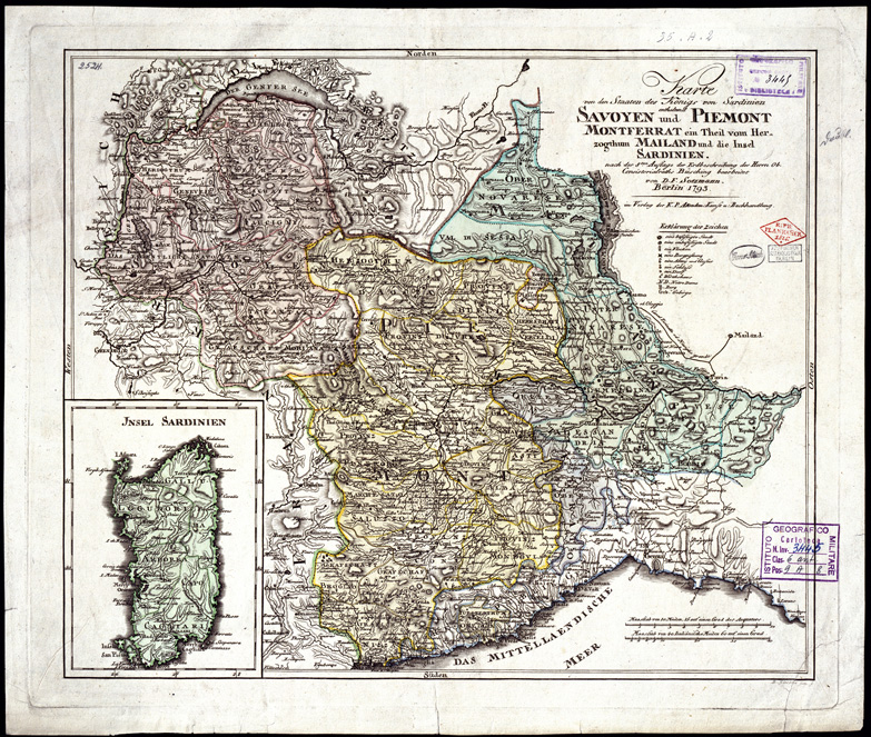 "Nach der 8 ten auflage der erdbeschreibung des herrn ob. Consistorialrathes Busching bearbitet von D.F. Sotzmann Berlin 1793. In verlag der KP Akadem: kunftu: Buchhandtung. In alto a destra la legenda, sempre a destra in basso 2 scale grafiche. A sinistra un riquadro con all'interno raffigurata l'Isola di Sardegna. Autore D.F. Sotzaim. Rappresentazione orografica a tratteggio, carta finemente acquerellata, derivante da incisione su rame.Toponomastica in lingua tedesca"