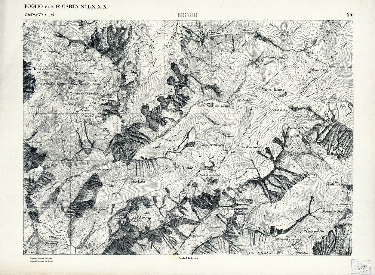"Rilievo regolare in 99 tavolette (minute di campagna) del territorio della Contea di Nizza. Il rilievo è dimostrato a curve orizzontali,tracciate all'equidistanza di 10 metri. Gli operatori furono ufficiali di armi diverse,probabilmente allievi della scuola di S.M. La collezione di Biblioteca è una copia incompleta dell'intero documento presente nell'Archivio Cartografico. "