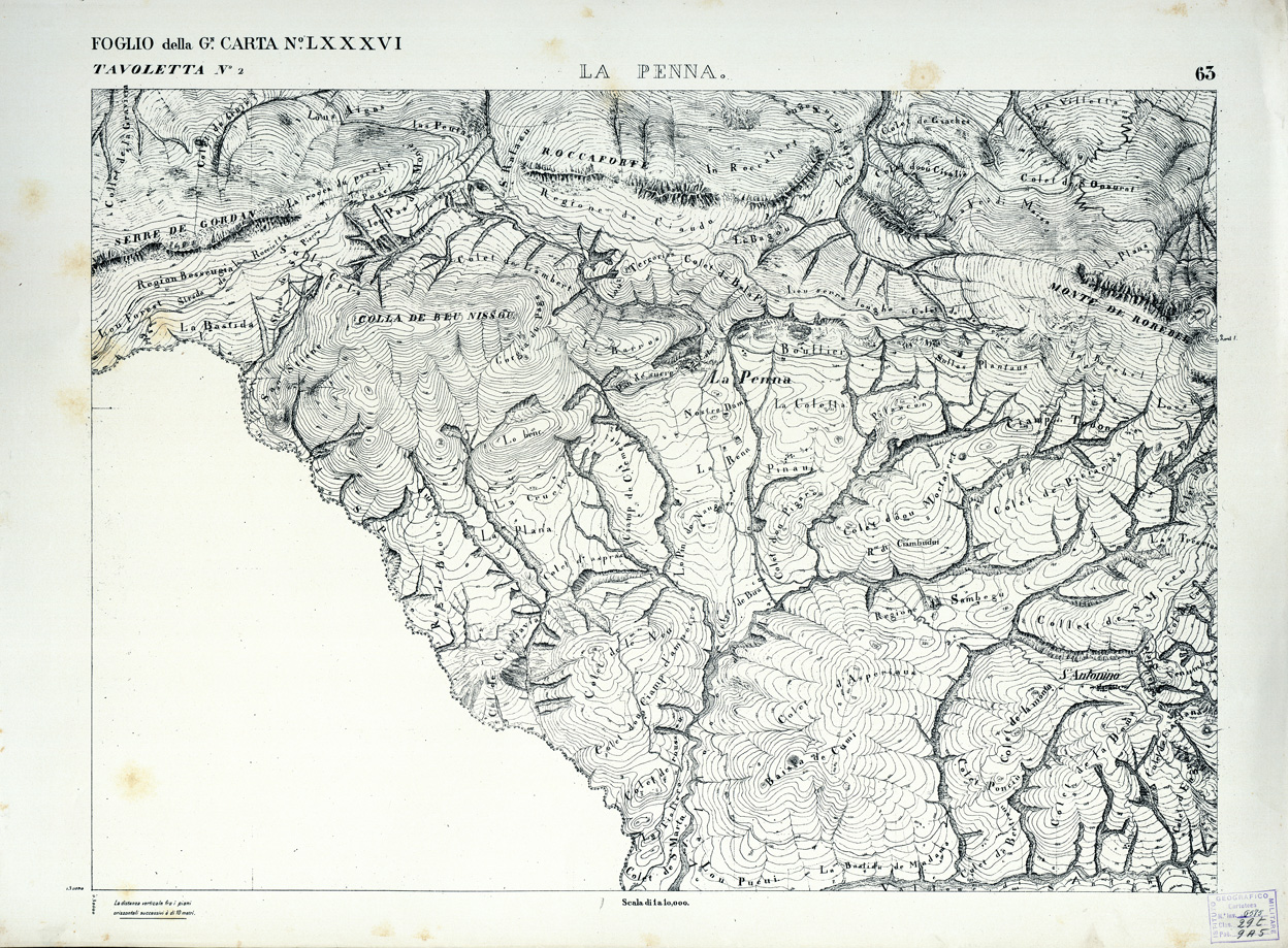 "Rilievo regolare in 99 tavolette (minute di campagna) del territorio della Contea di Nizza. Il rilievo è dimostrato a curve orizzontali,tracciate all'equidistanza di 10 metri. Gli operatori furono ufficiali di armi diverse,probabilmente allievi della scuola di S.M. La collezione di Biblioteca è una copia incompleta dell'intero documento presente nell'Archivio Cartografico. "