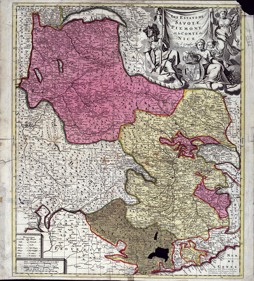 "...PAR LE SR. SANSON GEOGR. ORDINAIRE DU ROY. Un foglio tratto da incisione su rame con territori e confini politici distinti a vari colori. Orografia dimostrata a monticelli: abitati principali rappresentati schematicamente in pianta: i secondari con torri e case o con circolini. E' tracciata la rete stradale. Vari segni convenzionali distinguono le grandi città, città minori, villaggi, castelli, abbazie, chiostri, mulini, università, arcivescovadi e vescovadi, i feudi della chiesa e dello stato. Il territorio rappresentato si estende dal Lago di Ginevra (nord) a Monaco (sud) e da Grenoble (ovest) ad Aqui (est). In basso a destra trovasi scritto: "Amsterdam chez Pierre Schenk avec Privilege de Nos Seigneurs Les Etats de Hollande et de West-Frise". Scale grafiche in leghe di Germania e di Francia e in miglia italiane. A sinistra in basso al legenda dei segni convenzionali."