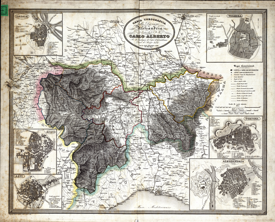 "Carta dedicata A.S.S.R.M: Carlo Alberto Re di Sardegna di Cipro di Gerusalemme Duca di Savoia, dal suo umiliss. Obbl. Fedeliss. suddito Gio Batta Maggi. Rappresentazione orografica a tratteggio. Sulla destra è presente la legenda dei segni convenzionali. Carta disegnata dietro le migliori carte e notizie edite. La carta è corredata delle piante di: Casale, Voghera, Tortona, Alessandria, Asti ed Acqui. Torino, presso l'editore G. B. Maggi."