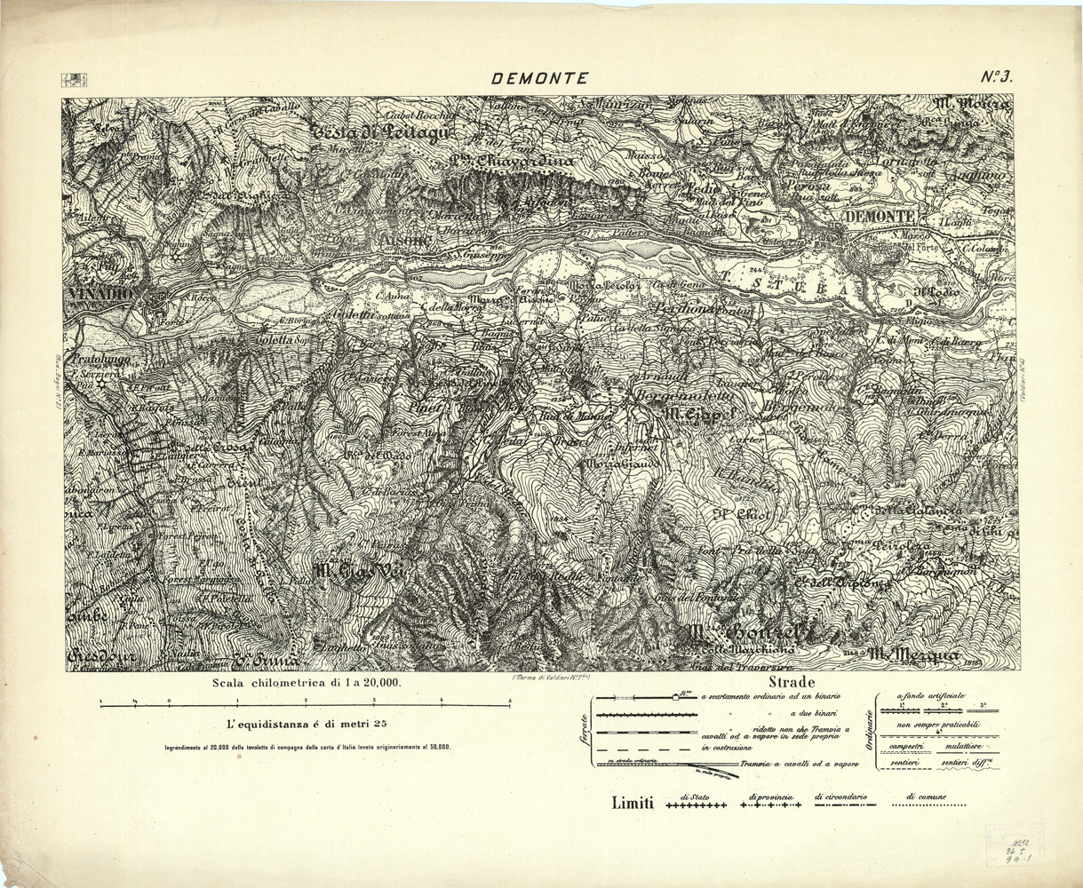 "...E DELLA ZONA LUNGO IL CONFINE NORD-EST. I fogli che hanno l'indicazione del numero e titolo in carattere verticale sono riduzioni al 20.000 delle tavolette originali levate alla scala di 1:10.000 negli anni 1833-1851, quelli che li hanno in carattere inclinato sono ingrandimenti al 20.000 delle recenti levate alla scala di 1:50.000. Le linee a tratti seguono il limite delle frazioni che compongono il foglio. L'equidistanza è di metri 25 ingrandimento al 20.000 delle tavolette di campagna della carta d'Italia levate originariamente al 50.000."