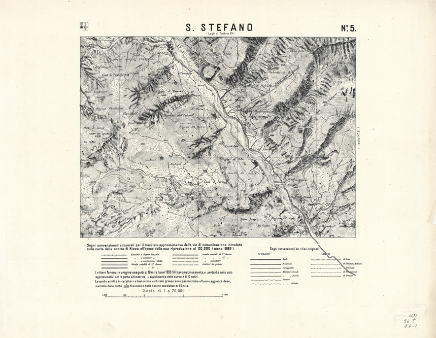 "...E DELLA ZONA LUNGO IL CONFINE NORD-EST. I fogli che hanno l'indicazione del numero e titolo in carattere verticale sono riduzioni al 20.000 delle tavolette originali levate alla scala di 1:10.000 negli anni 1833-1851, quelli che li hanno in carattere inclinato sono ingrandimenti al 20.000 delle recenti levate alla scala di 1:50.000. Le linee a tratti seguono il limite delle frazioni che compongono il foglio. In basso a sinistra ci sono i segni convenzionali adoperati per il tracciato approssimativo delle vie di comunicazione introdotte sulla carta della contea di Nizza all'epoca della sua riproduzione al 20.000 (anno 1889). In basso a destra i segni convenzionali dei rilievi originali. I rilievi furono in origine eseguiti al 10 mila (anni 1833-51) barometricamente, e pertanto sono solo approssimativi per la parte altimetrica. L'equidistanza delle curve è di 10 metri. Le quote scritte in caratteri a bastoncino verticale grosso sono geometriche e furono aggiunte desumendole dalla carta 1:80.000 francese o dalle nostre tavolette al 50 mila."
