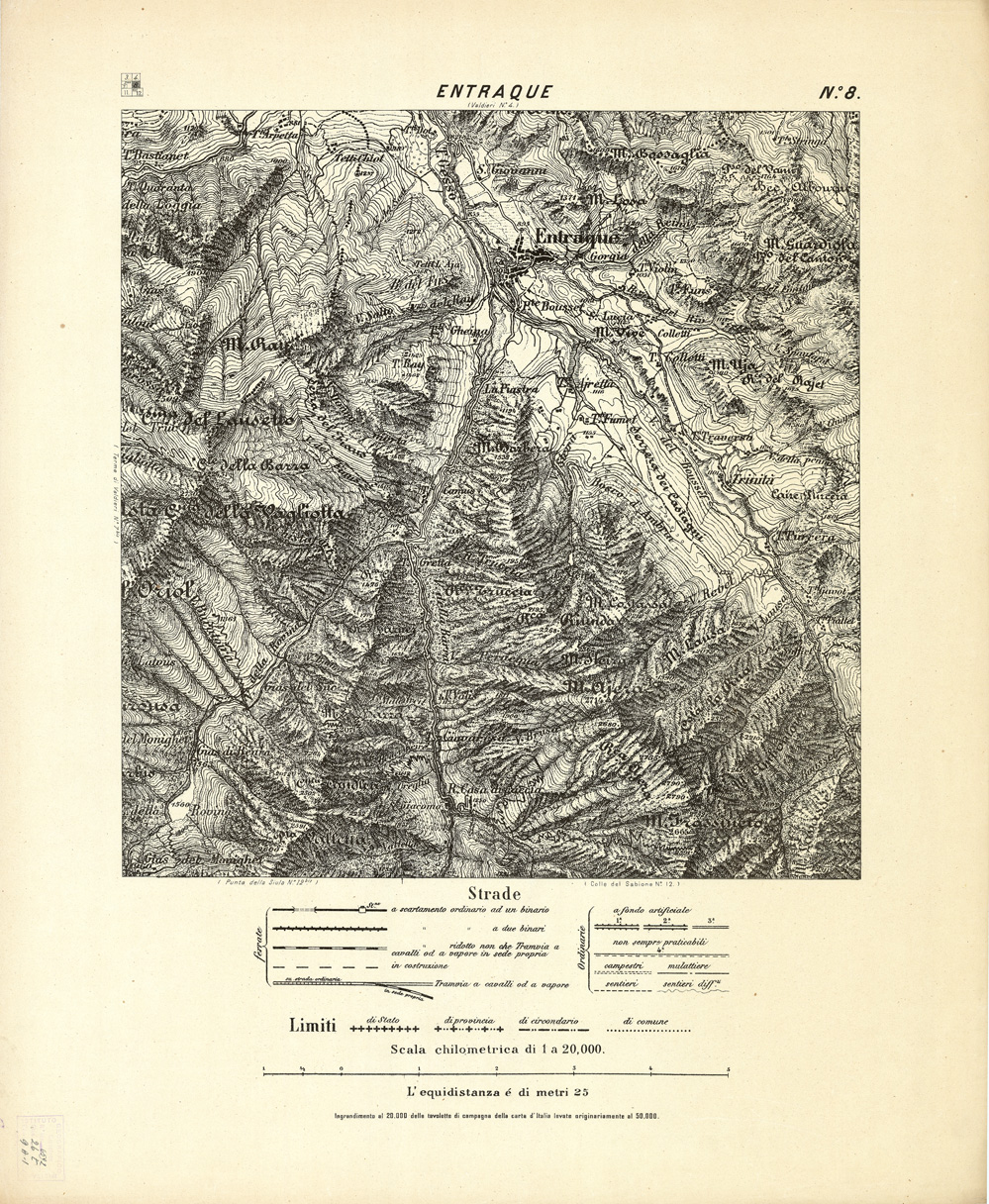 "...E DELLA ZONA LUNGO IL CONFINE NORD-EST. I fogli che hanno l'indicazione del numero e titolo in carattere verticale sono riduzioni al 20.000 delle tavolette originali levate alla scala di 1:10.000 negli anni 1833-1851, quelli che li hanno in carattere inclinato sono ingrandimenti al 20.000 delle recenti levate alla scala di 1:50.000. Le linee a tratti seguono il limite delle frazioni che compongono il foglio. L'equidistanza è di metri 25 ingrandimento al 20.000 delle tavolette di campagna della carta d'Italia levate originariamente al 50.000."