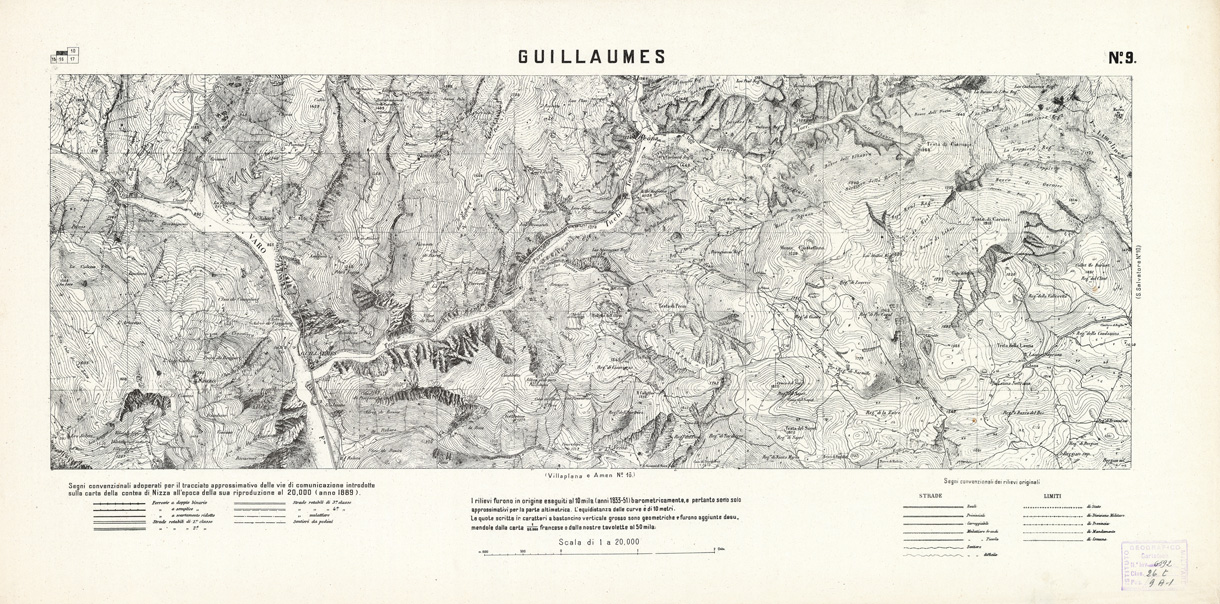 "...E DELLA ZONA LUNGO IL CONFINE NORD-EST. I fogli che hanno l'indicazione del numero e titolo in carattere verticale sono riduzioni al 20.000 delle tavolette originali levate alla scala di 1:10.000 negli anni 1833-1851, quelli che li hanno in carattere inclinato sono ingrandimenti al 20.000 delle recenti levate alla scala di 1:50.000. Le linee a tratti seguono il limite delle frazioni che compongono il foglio. In basso a sinistra ci sono i segni convenzionali adoperati per il tracciato approssimativo delle vie di comunicazione introdotte sulla carta della contea di Nizza all'epoca della sua riproduzione al 20.000 (anno 1889). In basso a destra i segni convenzionali dei rilievi originali. I rilievi furono in origine eseguiti al 10 mila (anni 1833-51) barometricamente, e pertanto sono solo approssimativi per la parte altimetrica. L'equidistanza delle curve è di 10 metri. Le quote scritte in caratteri a bastoncino verticale grosso sono geometriche e furono aggiunte desumendole dalla carta 1:80.000 francese o dalle nostre tavolette al 50 mila."