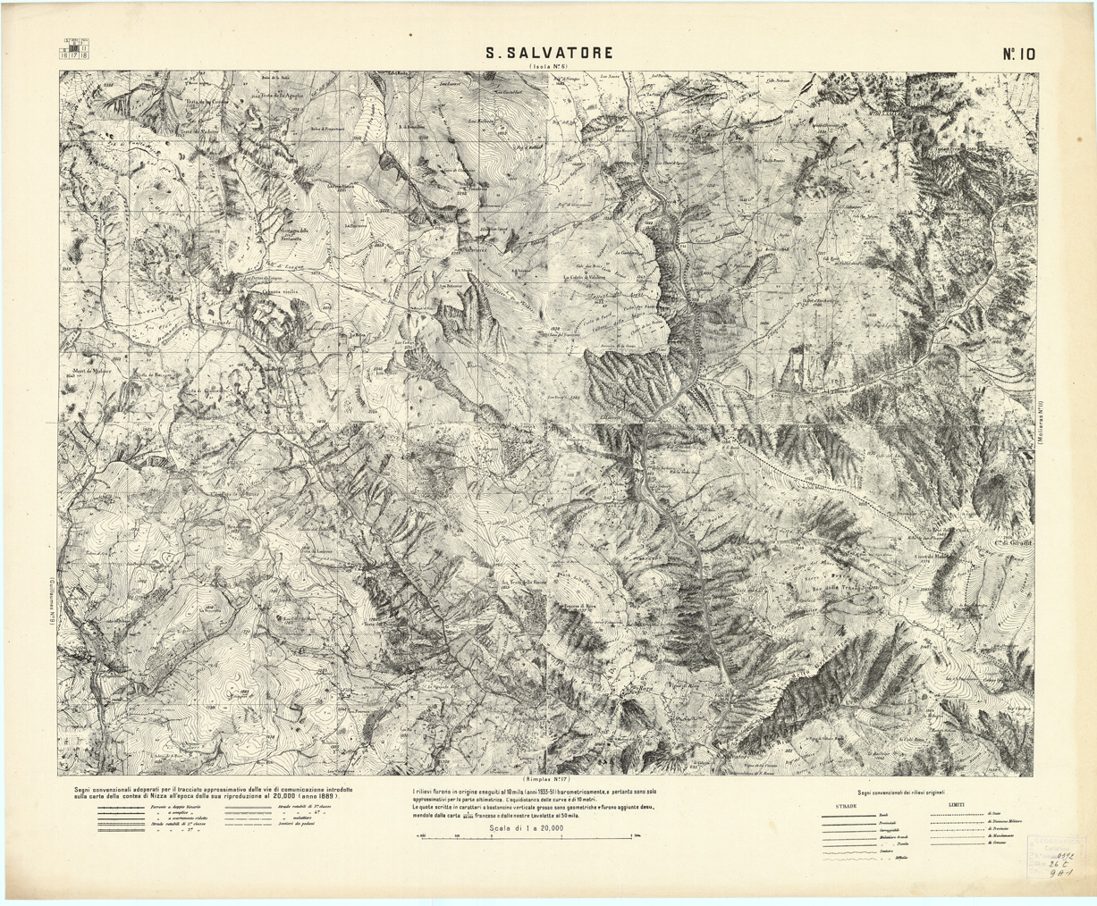 "...E DELLA ZONA LUNGO IL CONFINE NORD-EST. I fogli che hanno l'indicazione del numero e titolo in carattere verticale sono riduzioni al 20.000 delle tavolette originali levate alla scala di 1:10.000 negli anni 1833-1851, quelli che li hanno in carattere inclinato sono ingrandimenti al 20.000 delle recenti levate alla scala di 1:50.000. Le linee a tratti seguono il limite delle frazioni che compongono il foglio. In basso a sinistra ci sono i segni convenzionali adoperati per il tracciato approssimativo delle vie di comunicazione introdotte sulla carta della contea di Nizza all'epoca della sua riproduzione al 20.000 (anno 1889). In basso a destra i segni convenzionali dei rilievi originali. I rilievi furono in origine eseguiti al 10 mila (anni 1833-51) barometricamente, e pertanto sono solo approssimativi per la parte altimetrica. L'equidistanza delle curve è di 10 metri. Le quote scritte in caratteri a bastoncino verticale grosso sono geometriche e furono aggiunte desumendole dalla carta 1:80.000 francese o dalle nostre tavolette al 50 mila."