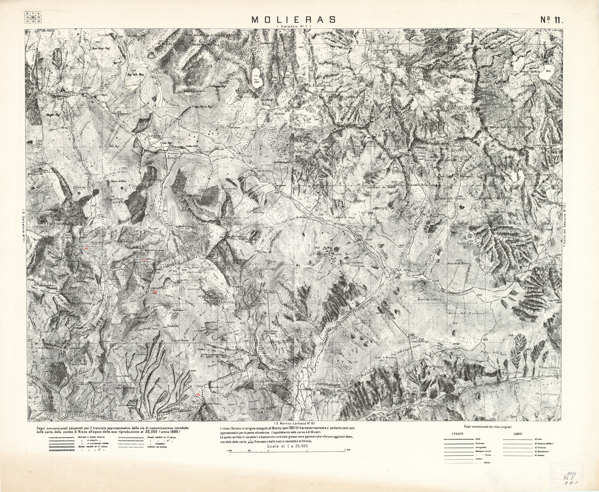 "...E DELLA ZONA LUNGO IL CONFINE NORD-EST. I fogli che hanno l'indicazione del numero e titolo in carattere verticale sono riduzioni al 20.000 delle tavolette originali levate alla scala di 1:10.000 negli anni 1833-1851, quelli che li hanno in carattere inclinato sono ingrandimenti al 20.000 delle recenti levate alla scala di 1:50.000. Le linee a tratti seguono il limite delle frazioni che compongono il foglio. In basso a sinistra ci sono i segni convenzionali adoperati per il tracciato approssimativo delle vie di comunicazione introdotte sulla carta della contea di Nizza all'epoca della sua riproduzione al 20.000 (anno 1889). In basso a destra i segni convenzionali dei rilievi originali. I rilievi furono in origine eseguiti al 10 mila (anni 1833-51) barometricamente, e pertanto sono solo approssimativi per la parte altimetrica. L'equidistanza delle curve è di 10 metri. Le quote scritte in caratteri a bastoncino verticale grosso sono geometriche e furono aggiunte desumendole dalla carta 1:80.000 francese o dalle nostre tavolette al 50 mila."