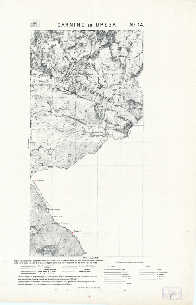 "...E DELLA ZONA LUNGO IL CONFINE NORD-EST. I fogli che hanno l'indicazione del numero e titolo in carattere verticale sono riduzioni al 20.000 delle tavolette originali levate alla scala di 1:10.000 negli anni 1833-1851, quelli che li hanno in carattere inclinato sono ingrandimenti al 20.000 delle recenti levate alla scala di 1:50.000. Le linee a tratti seguono il limite delle frazioni che compongono il foglio. In basso a sinistra ci sono i segni convenzionali adoperati per il tracciato approssimativo delle vie di comunicazione introdotte sulla carta della contea di Nizza all'epoca della sua riproduzione al 20.000 (anno 1889). In basso a destra i segni convenzionali dei rilievi originali. I rilievi furono in origine eseguiti al 10 mila (anni 1833-51) barometricamente, e pertanto sono solo approssimativi per la parte altimetrica. L'equidistanza delle curve è di 10 metri. Le quote scritte in caratteri a bastoncino verticale grosso sono geometriche e furono aggiunte desumendole dalla carta 1:80.000 francese o dalle nostre tavolette al 50 mila."