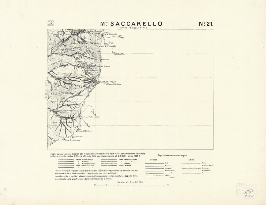 "...E DELLA ZONA LUNGO IL CONFINE NORD-EST. I fogli che hanno l'indicazione del numero e titolo in carattere verticale sono riduzioni al 20.000 delle tavolette originali levate alla scala di 1:10.000 negli anni 1833-1851, quelli che li hanno in carattere inclinato sono ingrandimenti al 20.000 delle recenti levate alla scala di 1:50.000. Le linee a tratti seguono il limite delle frazioni che compongono il foglio. In basso a sinistra ci sono i segni convenzionali adoperati per il tracciato approssimativo delle vie di comunicazione introdotte sulla carta della contea di Nizza all'epoca della sua riproduzione al 20.000 (anno 1889). In basso a destra i segni convenzionali dei rilievi originali. I rilievi furono in origine eseguiti al 10 mila (anni 1833-51) barometricamente, e pertanto sono solo approssimativi per la parte altimetrica. L'equidistanza delle curve è di 10 metri. Le quote scritte in caratteri a bastoncino verticale grosso sono geometriche e furono aggiunte desumendole dalla carta 1:80.000 francese o dalle nostre tavolette al 50 mila."