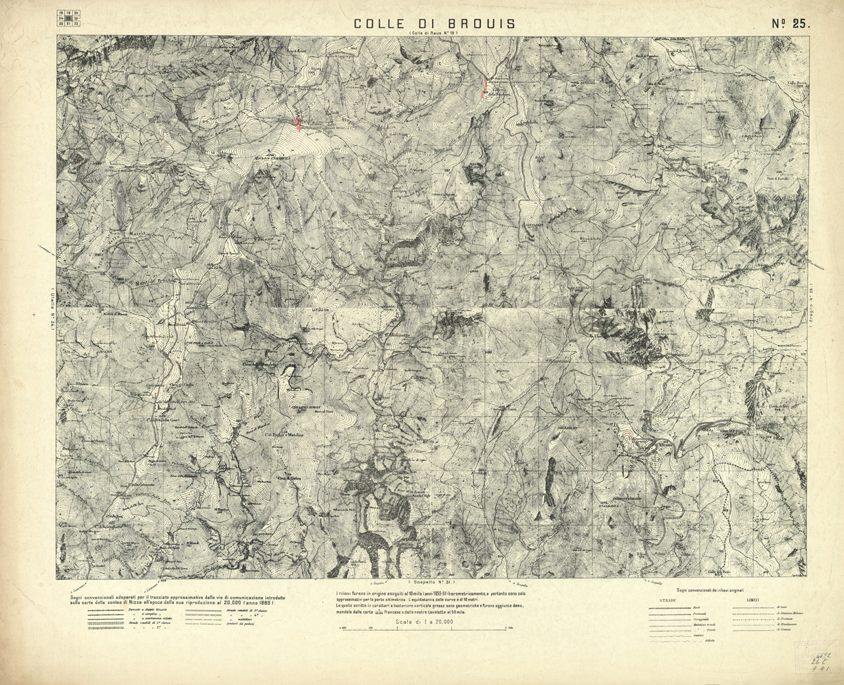 "...E DELLA ZONA LUNGO IL CONFINE NORD-EST. I fogli che hanno l'indicazione del numero e titolo in carattere verticale sono riduzioni al 20.000 delle tavolette originali levate alla scala di 1:10.000 negli anni 1833-1851, quelli che li hanno in carattere inclinato sono ingrandimenti al 20.000 delle recenti levate alla scala di 1:50.000. Le linee a tratti seguono il limite delle frazioni che compongono il foglio. In basso a sinistra ci sono i segni convenzionali adoperati per il tracciato approssimativo delle vie di comunicazione introdotte sulla carta della contea di Nizza all'epoca della sua riproduzione al 20.000 (anno 1889). In basso a destra i segni convenzionali dei rilievi originali. I rilievi furono in origine eseguiti al 10 mila (anni 1833-51) barometricamente, e pertanto sono solo approssimativi per la parte altimetrica. L'equidistanza delle curve è di 10 metri. Le quote scritte in caratteri a bastoncino verticale grosso sono geometriche e furono aggiunte desumendole dalla carta 1:80.000 francese o dalle nostre tavolette al 50 mila."