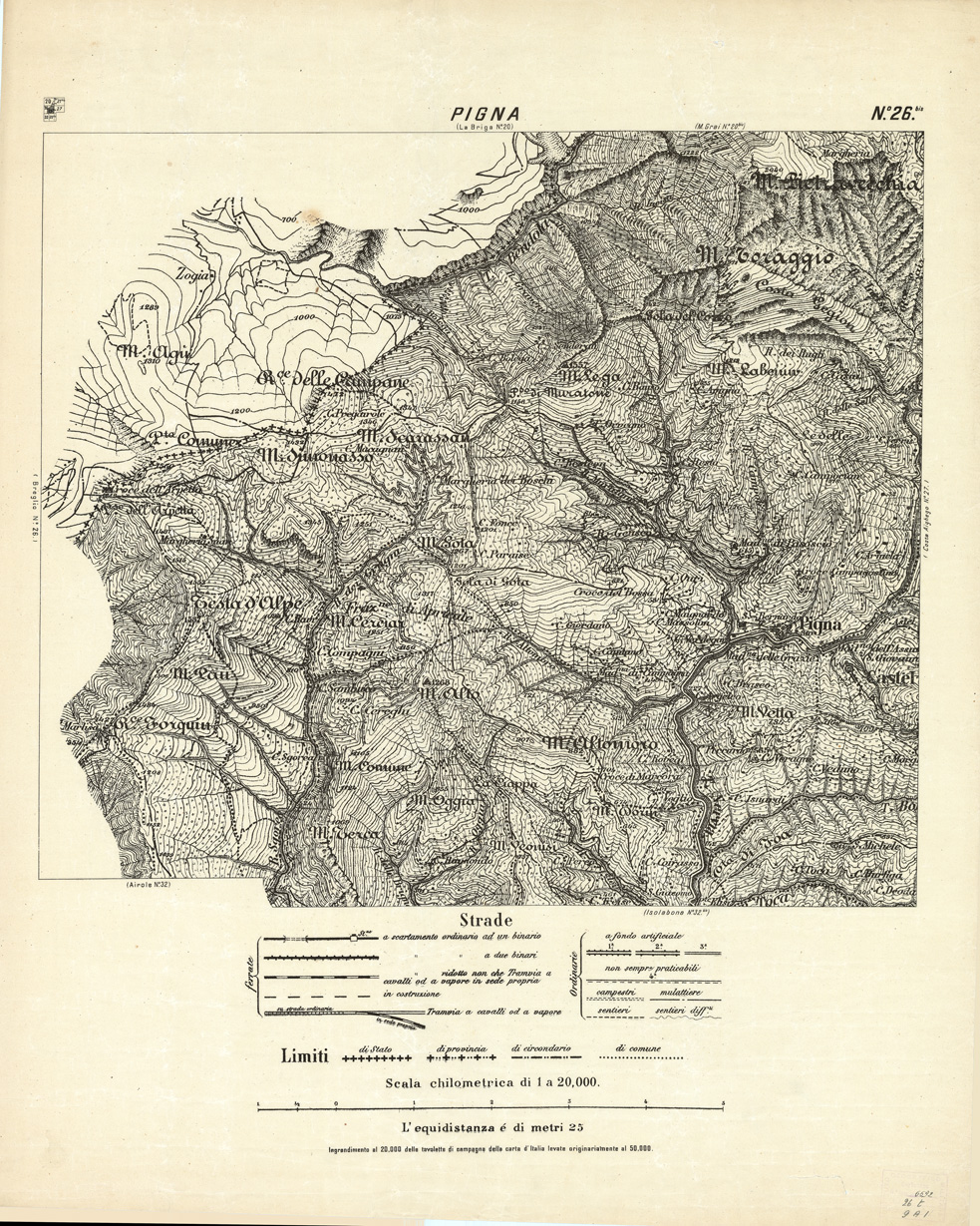 "...E DELLA ZONA LUNGO IL CONFINE NORD-EST. I fogli che hanno l'indicazione del numero e titolo in carattere verticale sono riduzioni al 20.000 delle tavolette originali levate alla scala di 1:10.000 negli anni 1833-1851, quelli che li hanno in carattere inclinato sono ingrandimenti al 20.000 delle recenti levate alla scala di 1:50.000. Le linee a tratti seguono il limite delle frazioni che compongono il foglio. L'equidistanza è di metri 25 ingrandimento al 20.000 delle tavolette di campagna della carta d'Italia levate originariamente al 50.000."