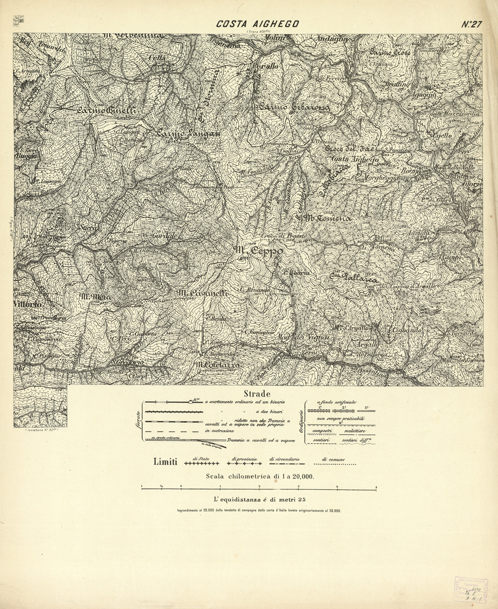 "...E DELLA ZONA LUNGO IL CONFINE NORD-EST. I fogli che hanno l'indicazione del numero e titolo in carattere verticale sono riduzioni al 20.000 delle tavolette originali levate alla scala di 1:10.000 negli anni 1833-1851, quelli che li hanno in carattere inclinato sono ingrandimenti al 20.000 delle recenti levate alla scala di 1:50.000. Le linee a tratti seguono il limite delle frazioni che compongono il foglio. L'equidistanza è di metri 25 ingrandimento al 20.000 delle tavolette di campagna della carta d'Italia levate originariamente al 50.000."