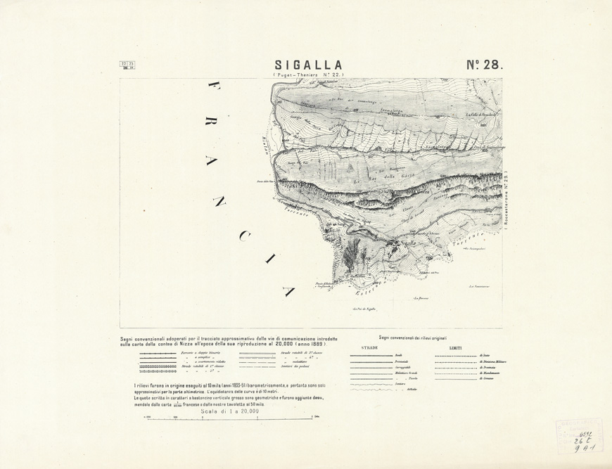"...E DELLA ZONA LUNGO IL CONFINE NORD-EST. I fogli che hanno l'indicazione del numero e titolo in carattere verticale sono riduzioni al 20.000 delle tavolette originali levate alla scala di 1:10.000 negli anni 1833-1851, quelli che li hanno in carattere inclinato sono ingrandimenti al 20.000 delle recenti levate alla scala di 1:50.000. Le linee a tratti seguono il limite delle frazioni che compongono il foglio. In basso a sinistra ci sono i segni convenzionali adoperati per il tracciato approssimativo delle vie di comunicazione introdotte sulla carta della contea di Nizza all'epoca della sua riproduzione al 20.000 (anno 1889). In basso a destra i segni convenzionali dei rilievi originali. I rilievi furono in origine eseguiti al 10 mila (anni 1833-51) barometricamente, e pertanto sono solo approssimativi per la parte altimetrica. L'equidistanza delle curve è di 10 metri. Le quote scritte in caratteri a bastoncino verticale grosso sono geometriche e furono aggiunte desumendole dalla carta 1:80.000 francese o dalle nostre tavolette al 50 mila."