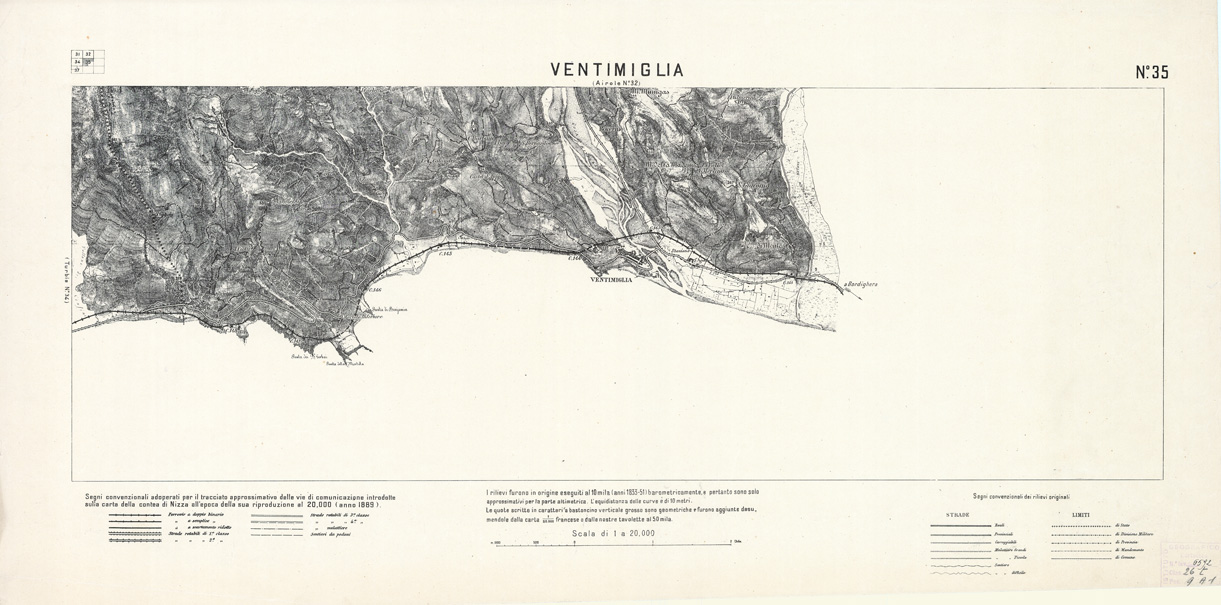 "...E DELLA ZONA LUNGO IL CONFINE NORD-EST. I fogli che hanno l'indicazione del numero e titolo in carattere verticale sono riduzioni al 20.000 delle tavolette originali levate alla scala di 1:10.000 negli anni 1833-1851, quelli che li hanno in carattere inclinato sono ingrandimenti al 20.000 delle recenti levate alla scala di 1:50.000. Le linee a tratti seguono il limite delle frazioni che compongono il foglio. In basso a sinistra ci sono i segni convenzionali adoperati per il tracciato approssimativo delle vie di comunicazione introdotte sulla carta della contea di Nizza all'epoca della sua riproduzione al 20.000 (anno 1889). In basso a destra i segni convenzionali dei rilievi originali. I rilievi furono in origine eseguiti al 10 mila (anni 1833-51) barometricamente, e pertanto sono solo approssimativi per la parte altimetrica. L'equidistanza delle curve è di 10 metri. Le quote scritte in caratteri a bastoncino verticale grosso sono geometriche e furono aggiunte desumendole dalla carta 1:80.000 francese o dalle nostre tavolette al 50 mila."