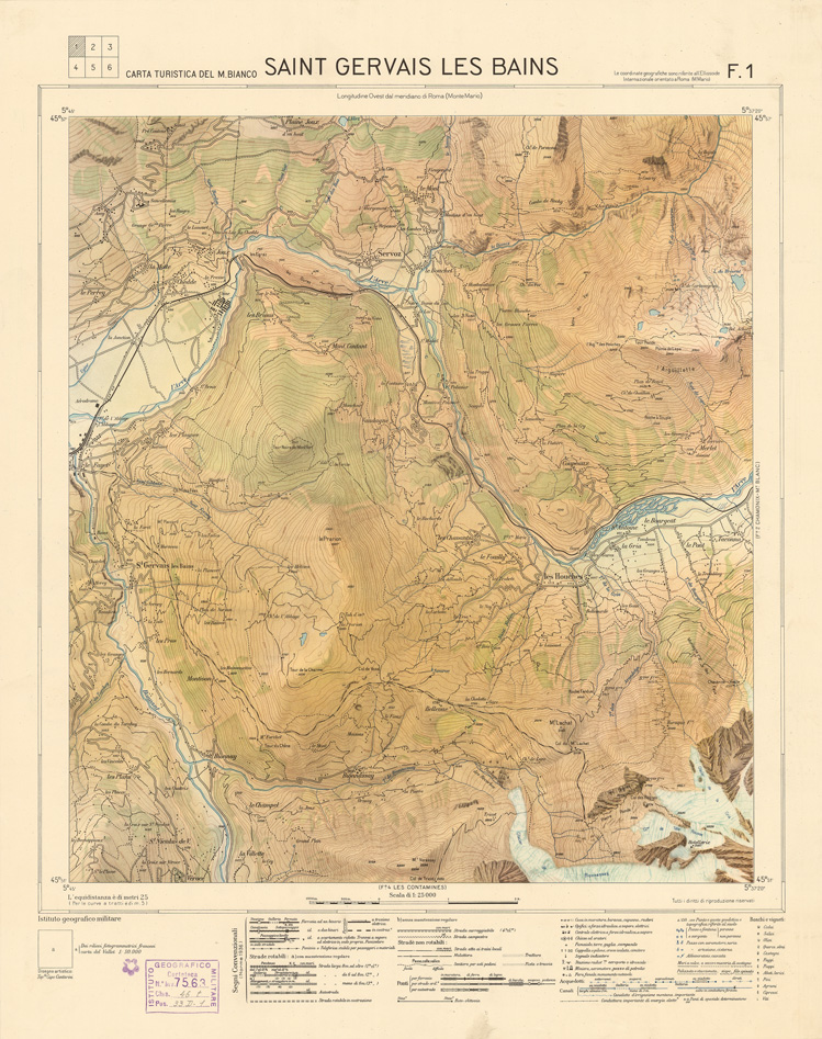 "Le coordinate geografiche sono riferite all'Ellissoide Internazionale orientato a Roma (M. Mario). Dai rilievi fotogrammetrici francesi carta del Vallot al 50.000. Rappresentazione orografica a curve di livello l'equidistanza è di metri 25, per le curve a tratti è di m. 5. In basso è presente la legenda dei segni convenzionali. Disegno artistico: Topografo Capo Cantarini. I.G.M. (FI)."