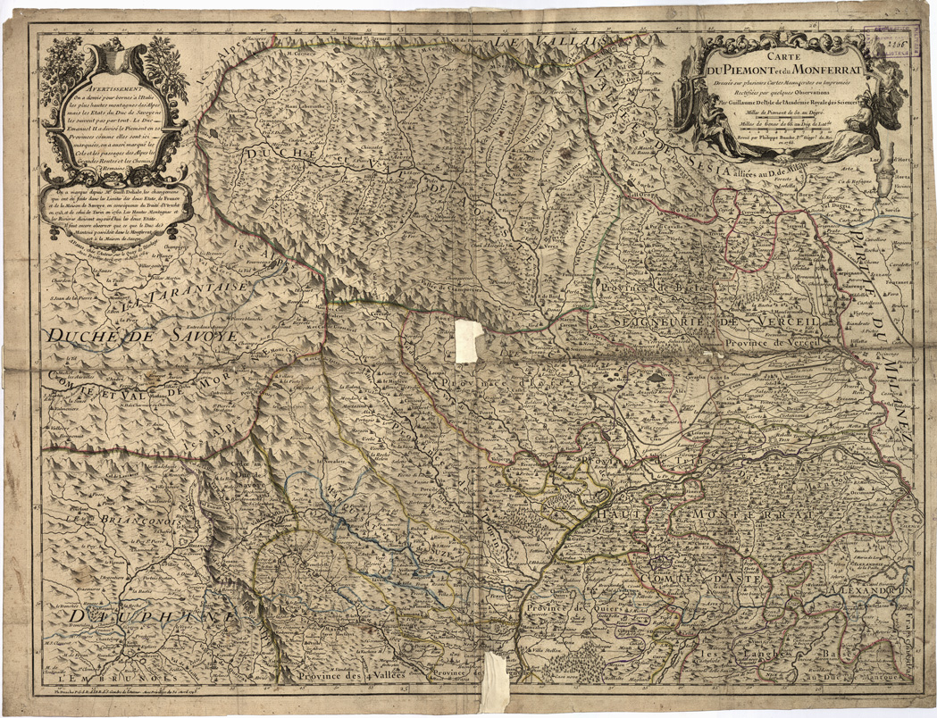 "...DRESSEE SUR PLUSIEURS CARTE MANUSCRITES ON IMPRIMEE RECTIFIEES PAR QUELQUES OBSERVATIONS PAR GUILLAUME DE L'ISLE DE L'ACADEMIE ROYALE DES SCIENCES. REVUE PAR PHILIPPE BAUCHE P.ER GEOGR. DU ROI EN 1765. Carta in due fogli tratti da incisione su rame stampati in nero con confini politici a colori. Orografia a monticelli. Abitati principali rappresentati schematicamente in pianta: i secondari con torri e case. Il foglio settentrionale reca in alto a sinistra il seguente "Avertissement: on a donne pour bornes à l'Italie - les plus hautes montagnes des Alpes - mais les Etats du Duc de Sovoye ne - les suivent pas par pont. Le Duc - Emanuel II a divisé le Piemont en 20 - Provinces comme elles sont ici - marqués e, on a aussi marqué les Cots et les Passages des Alpes les - Grandes Routes et les Chemins - Romains". "On a marqué depuis Mr. Guill. Delisle, les changemens - qui on été faits dans les Limites des deux Etats, de France - et de la Maison de Savoye en consequences du Traité d'Utrecht - en 1713, et de celui de Turin en 1760 les Hautes Montagnes et - les Rivières divisent aujourd'hui, les deux Etats. Il faut encore observer que ce que le Duc de - Mantoue possedoit dans le Monferrat est à la Maison de Savoy". "A Paris, chés l'Auteur, sur le Quay de l'Horloge Avec Privilege Avril 1717 et Auut 1764". In basso a sinistra è scritto: "Ph. Buache P. G. d. R. d. l'A. R. d. S. Gendre de l'Auteur. Avec Privilège du 30 Avril 1745". Il foglio meridionale reca in alto il titolo "Partie Meridionale du Piemont et du Monferrat. Par Guillaume Del'Isle de l'Academie R.le des Sciences". In basso a sinistra è una cartina "Environs de Nice et de Ville-franche". Scale grafiche in miglia di Piemonte, di Genova e di Francia."