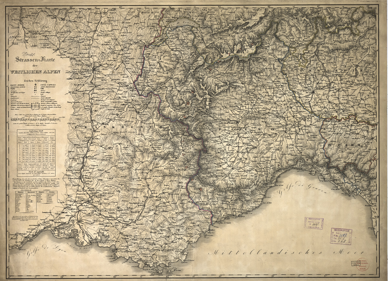 "Rappresentazione orografica a tratteggio. Sulla sinistra recasi la legenda dei segni convenzionali."