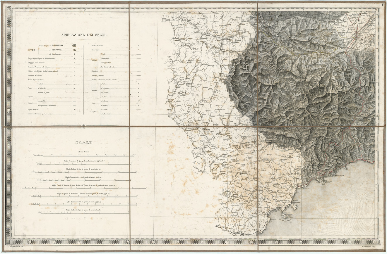 "Carta pregevolissima in sei fogli incisi su rame da A. Lecoq. G. Arghinenti, G. Biasoli, stampati in nero, riduzione della Carta Topografica in 90 fogli alla scala di 1 : 50 000 dello stesso R. Corpo di S. M. Generale. Proiezione di Flamstead modificata. Origine delle coordinate il R. Osservatorio di Torino. Orografia rappresentata con fine artistico tratteggio a luce obliqua. Abitati distinti in base alla loro importanza amministrativa strade classificate in reali, provinciali, carreggiabili, mulattiere e sentieri. Sono inoltre indicati ponti, argini, canali, acque termali, miniere, cave, ecc., e i confini di stato e di provincia. Il foglio N° 2 contiene il titolo e un " Cenno sulla formazione della carta ". Il foglio N° 5 contiene la leggenda dei segni convenzionali e le scale grafiche (8, in misure antiche italiane ed estere). Nel foglio N° 6 trovasi una cartina sussidiaria per l'isola di Capraia (Cfr. A. MORI, La Cartografia Ufficiale in Italia e l'I.G.M., 1922, pagg. 22-24). Cinque copie d'archivio quattro delle quali incise su rame (una mancante del foglio VI) ed una trasporto su pietra mancante del foglio IV. Gli esemplari n. 55, 55 bis, 57, 57 bis e 59 sono riproduzioni messe al corrente per gli anni 1859,1874,1883,1892 e 1898. L'originale è alla cartella d'archivio n. 40 documento n. 8."