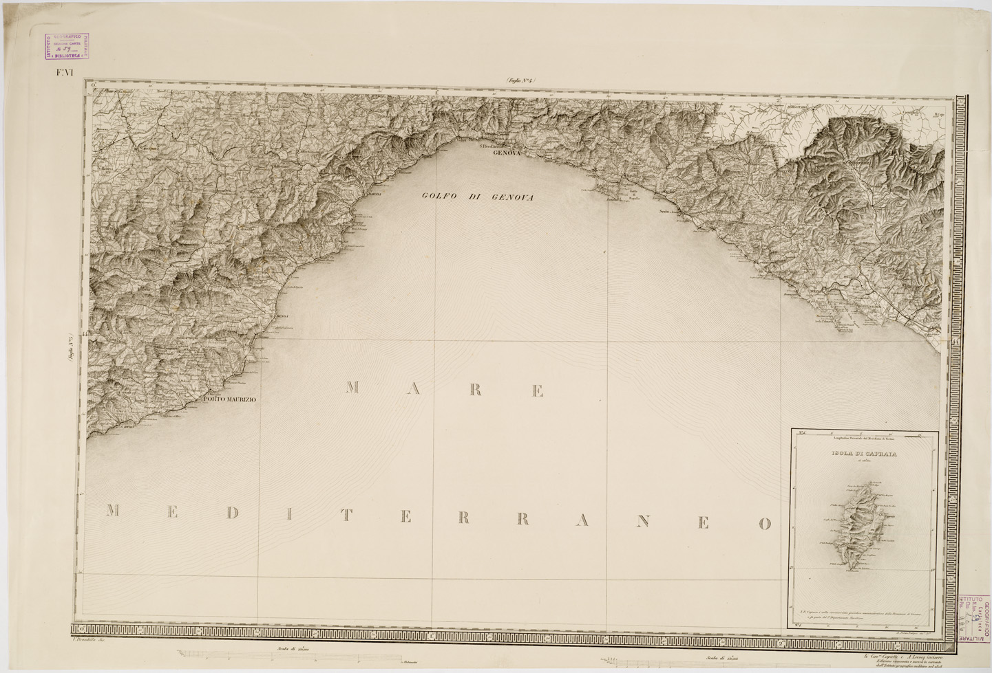 "...OPERA DEL REAL CORPO DI STATO MAGGIORE GENERALE. INCISA E PUBBLICATA L'ANNO 1841. Carta pregevolissima in sei fogli incisi su rame da A. Lecoq. G. Arghinenti, G. Biasoli, stampati in nero, riduzione della Carta Topografica in 90 fogli alla scala di 1 : 50 000 dello stesso R. Corpo di S. M. Generale. Proiezione di Flamstead modificata. Origine delle coordinate il R. Osservatorio di Torino. Orografia rappresentata con fine artistico tratteggio a luce obliqua. Abitati distinti in base alla loro importanza amministrativa strade classificate in reali, provinciali, carreggiabili, mulattiere e sentieri. Sono inoltre indicati ponti, argini, canali, acque termali, miniere, cave, ecc., e i confini di stato e di provincia. Il foglio N° 2 contiene il titolo e un " Cenno sulla formazione della carta ". Il foglio N° 5 contiene la leggenda dei segni convenzionali e le scale grafiche (8, in misure antiche italiane ed estere). Nel foglio N° 6 trovasi una cartina sussidiaria per l'isola di Capraia (Cfr. A. MORI, La Cartografia Ufficiale in Italia e l'I.G.M., 1922, pagg. 22-24). Cinque copie d'archivio quattro delle quali incise su rame (una mancante del foglio VI) ed una trasporto su pietra mancante del foglio IV. Gli esemplari n. 55, 55 bis, 57, 57 bis e 59 sono riproduzioni messe al corrente per gli anni 1859,1874,1883,1892 e 1898. L'originale è alla cartella d'archivio n. 40 documento n. 8."