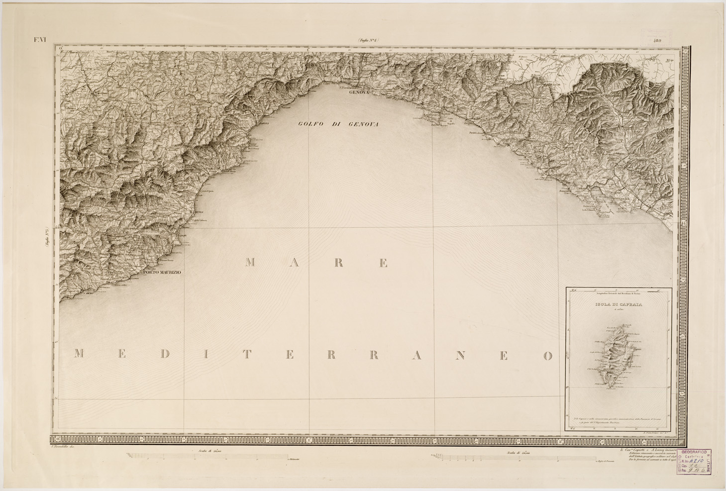 "...OPERA DEL REAL CORPO DI STATO MAGGIORE GENERALE. INCISA E PUBBLICATA L'ANNO 1841. Carta pregevolissima in sei fogli incisi su rame da A. Lecoq. G. Arghinenti, G. Biasoli, stampati in nero, riduzione della Carta Topografica in 90 fogli alla scala di 1 : 50 000 dello stesso R. Corpo di S. M. Generale. Proiezione di Flamstead modificata. Origine delle coordinate il R. Osservatorio di Torino. Orografia rappresentata con fine artistico tratteggio a luce obliqua. Abitati distinti in base alla loro importanza amministrativa strade classificate in reali, provinciali, carreggiabili, mulattiere e sentieri. Sono inoltre indicati ponti, argini, canali, acque termali, miniere, cave, ecc., e i confini di stato e di provincia. Il foglio N° 2 contiene il titolo e un " Cenno sulla formazione della carta ". Il foglio N° 5 contiene la leggenda dei segni convenzionali e le scale grafiche (8, in misure antiche italiane ed estere). Nel foglio N° 6 trovasi una cartina sussidiaria per l'isola di Capraia (Cfr. A. MORI, La Cartografia Ufficiale in Italia e l'I.G.M., 1922, pagg. 22-24). Cinque copie d'archivio quattro delle quali incise su rame (una mancante del foglio VI) ed una trasporto su pietra mancante del foglio IV. Gli esemplari n. 55, 55 bis, 57, 57 bis e 59 sono riproduzioni messe al corrente per gli anni 1859,1874,1883,1892 e 1898. L'originale è alla cartella d'archivio n. 40 documento n. 8."
