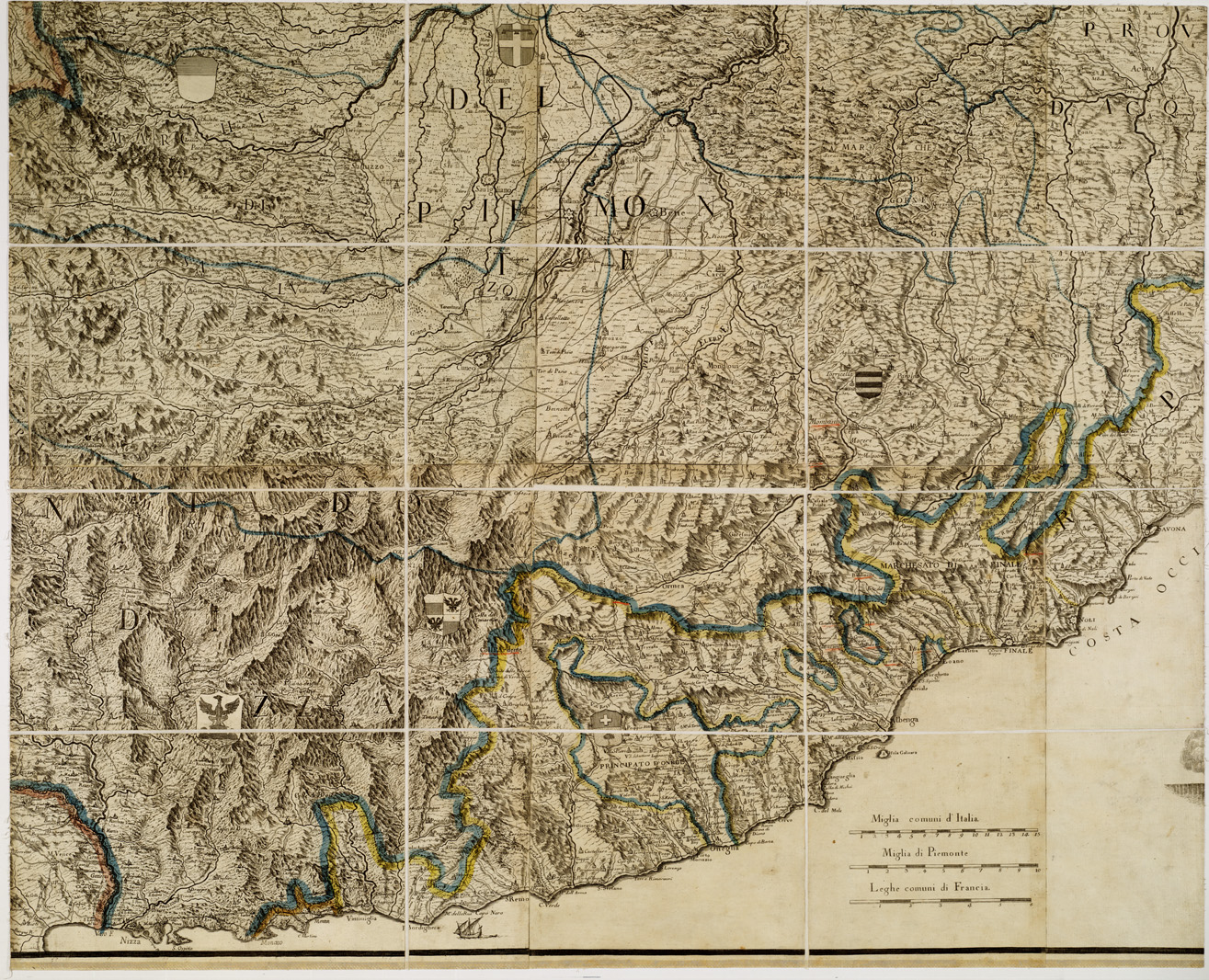 "...DATA IN LUCE DALL'INGEGNERE BORGONIO NEL 1683 CORRETTA ED ACCRESCIUTA NELL'ANNO 1772. Nuova edizione della così detta "Carta di Madama Reale" costruita dall'ingegnere cartografo G. T. Borgonio disegnatore e calligrafo, addetto fin dal 1650 alla corte Sabauda, e pubblicata nel 1680 in 15 fogli incisi su rame. La carta del Borgonio rappresenta un grande progresso nella cartografia del Piemonte essendo essa di gran lunga superiore alle precedenti produzioni cartografiche di quella regione. Per quanto non poggiata su una vera e propria base geometrica, sì da doverne accusare l'inesattezza nell'orientamento e nella misura delle distanze, essa nondimeno è particolarmente pregevole sia per la ricchezza di informazioni relative agli abitati, strade, corsi d'acqua, sia per la rappresentazione dell'orografia efficacemente dimostrata alla cavaliera. La carta del Borgonio rimase famosa ed apprezzata per circa un secolo e mezzo: ad essa si ispirarono successivi cartografi come il Coronelli, De Fer, Mortier, R. de Vaugondy. Divenuta rarissima se ne pubblicarono nuove edizioni una delle quali a Londra nel 1765 a cura di A. Dury, e l'altra a Torino nel 1772 a cura dell'incisore piemontese Stagnone tratta dagli stessi rami del Borgonio ma corretti ed arricchiti, e con l'aggiunta di nuovi sì da estendere la carta alla Liguria e a parte della Lombardia. I rami della carta del Borgonio furono presi dai francesi nel 1792 e restituiti soltanto nel 1815. Una delle copie tratte da essi servì a Napoleone per la preparazione della battaglia di Marengo. Il rifacimento dello Stagnone posseduto dalla Biblioteca dell'I.G.M., si compone di 12 fogli montati su tela a stacchi. Annessa una riproduzione fotozincografica eseguita dall'I.G.M. in occasione dell'Esposizione Nazionale di Torino del 1898. Per la storia e la illustrazione della carta del Borgonio e delle sue nuove edizioni si veda A. MORI, "Tomaso Borgonio e la sua opera cartografica", in "Riv. Geogr. Ital.", XIII, 1906 e "La cartografia Ufficiale in Italia e l'I.G.M.". Firenze, 1922 dello stesso autore al Capitolo Regno di Sardegna. Quattro copie di cui: - copia in volume di 25 tavole originali - copia in fogli sciolti 25 originali - copia in fogli sciolti 25 riprodotti e incompleti - copia in fogli sciolti 12 originali."
