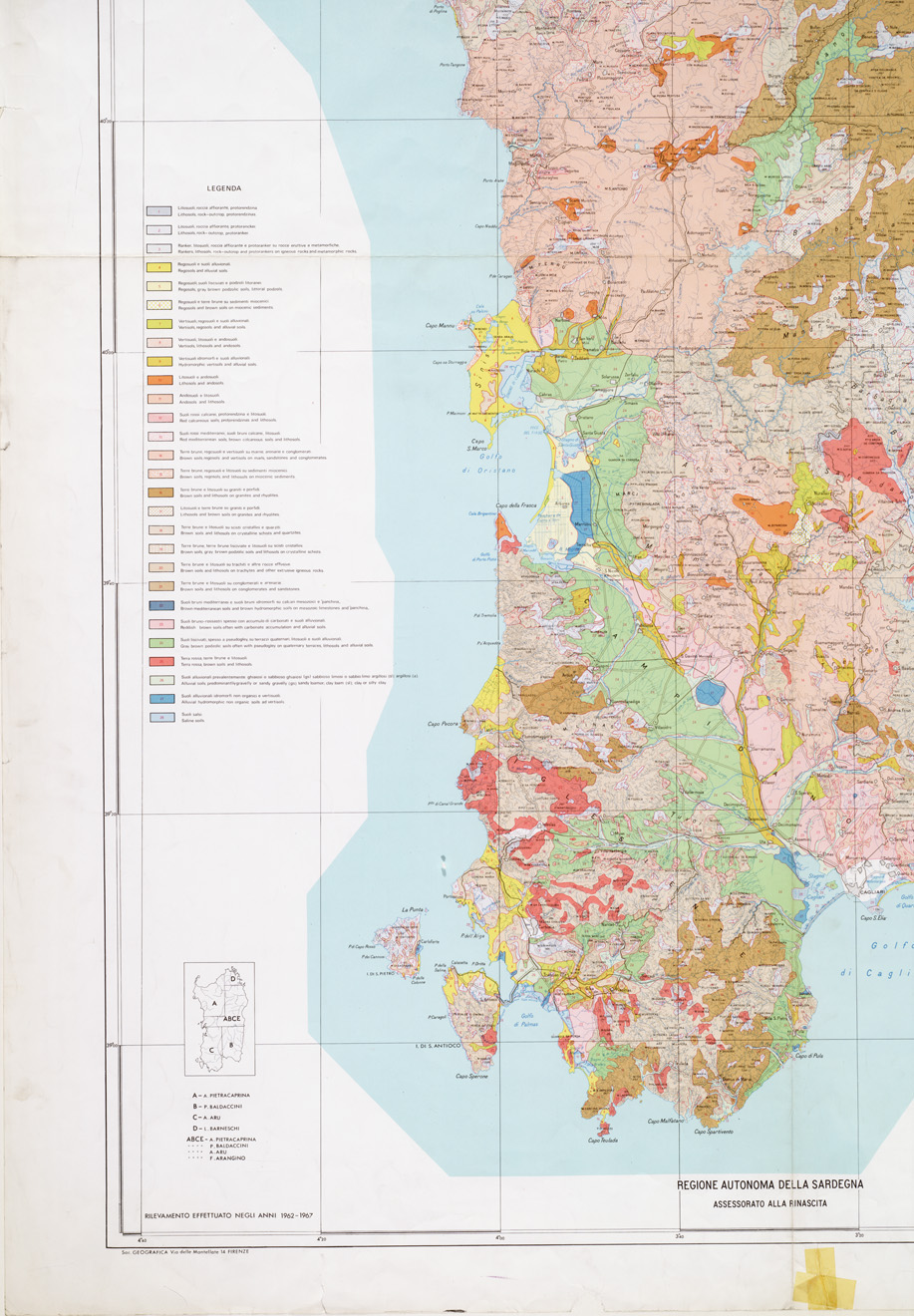 "Rappresentazione orografica a curve di livello. Sulla sinistra è presente la legenda dei colori. F. Arangino, A. Aru, P. Baldaccini, L. Barneschi e A. Pietracaprina. Istituto di Mineralogia e Geologia Facoltà di Agraria Università di Sassari. Comitato per la carta dei suoli d'Italia. Regione Autonoma della Sardegna Assessorato alla Rinascita. Soc. Geografica, Firenze. Stampato: A.G.A.F., A.&R. Senatori, Firenze."