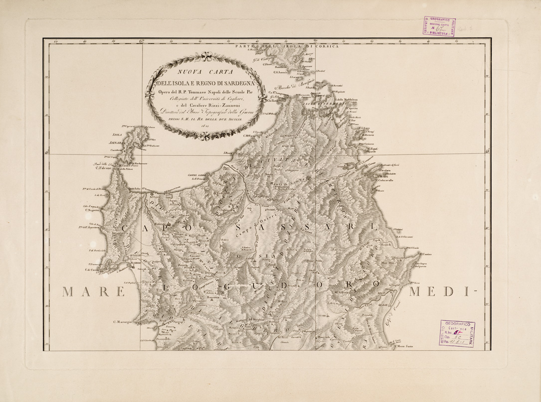 NUOVA CARTA DELL'ISOLA E REGNO DI SARDEGNAOPERA DEL R. P. TOMMASO NAPOLI DELLE SCUOLE PIE COLLEGIATO DELL'UNIVERSITA' DI CAGLIARI, E DEL CAV. RIZZI-ZANNONI DIRETTORE DEL BURO' TOPOGRAFICO DELLA GUERRA PRESSO S. M. IL RE DELLE DUE SICILIE, 1811.