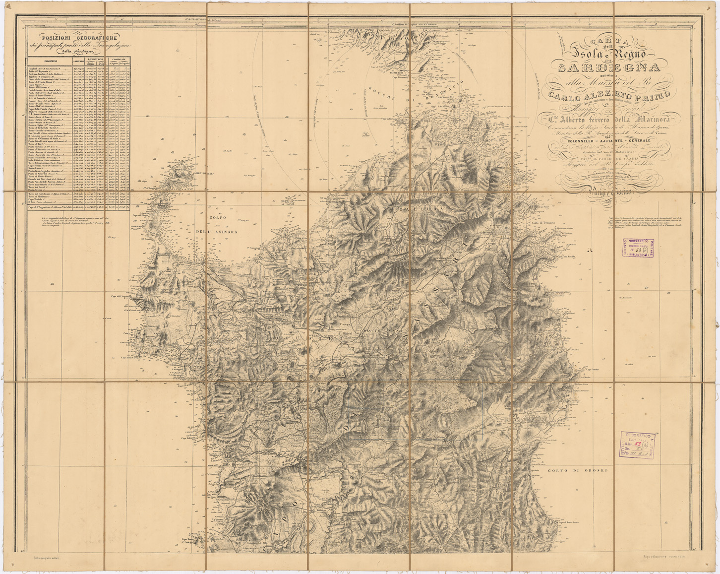 "Dedicata alla Maestà del Re Carlo Alberto Primo dal suo umilissimo e devotissimo suddito il Maggior Generale C.te Alberto Ferrero della Marmora, Comandante la Regia scuola di marina di Genova, Membro della R. Accademia delle Scienze di Torino già Colonnello -ajutante -Generale nel R. Corpo di Stato Maggiore Generale, assistito dal suo collaboratore * il cav. D. Carlo de Candia Maggiore nel R. Corpo suddetto. Incisa da Debuissons, Strada des bernardins, 24. Scritta da Arnoul impiegato al deposito della Guerra, addetto alla Carta di Francia_ Ibid. Paris e Torino, 1845. *Sui lavori trigonometrici e geodetici di questa carta incominciati nel 1824, e proseguiti quasi senza interruzioni sino al 1838, vedasi la notice inserita nel 1°vol 2 da Ediz (1839) del Voyage en sardaigne del medesimo autore. Parigi, presso Arthus Bertrand, strada Montefeuille, 23: e Chamerot, strada du jardinet, 13. All'angolo nord-ovest un riquadro con le coordinate geografiche dei principali punti della triangolazione della Sardegna. Il meridiano di riferimento è quello di Cagliari - Torre S. Pancrazio. Questa carta, su tela a stacchi, è una riproduzione edita dall'I.G.M. dell'edizione del gennaio 1884, utilizzata come base per la definizione del quadro d'unione delle carta al 100.000, 50.000, e 25.000, la quadrettatura è presente solo sul foglio sud."