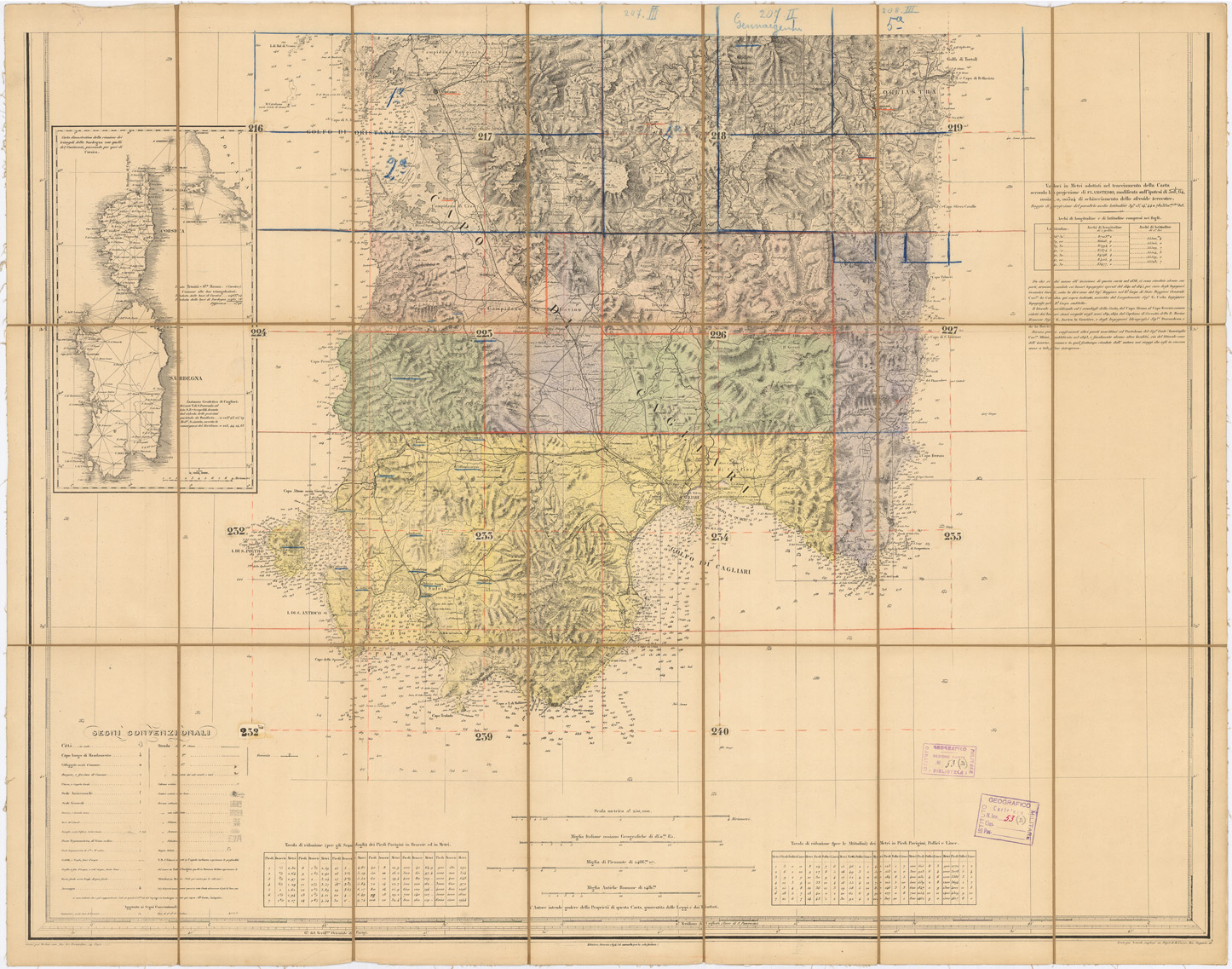 "Dedicata alla Maestà del Re Carlo Alberto Primo dal suo umilissimo e devotissimo suddito il Maggior Generale C.te Alberto Ferrero della Marmora, Comandante la Regia scuola di marina di Genova, Membro della R. Accademia delle Scienze di Torino già Colonnello -ajutante -Generale nel R. Corpo di Stato Maggiore Generale, assistito dal suo collaboratore * il cav. D. Carlo de Candia Maggiore nel R. Corpo suddetto. Incisa da Debuissons, Strada des bernardins, 24. Scritta da Arnoul impiegato al deposito della Guerra, addetto alla Carta di Francia_ Ibid. Paris e Torino, 1845. *Sui lavori trigonometrici e geodetici di questa carta incominciati nel 1824, e proseguiti quasi senza interruzioni sino al 1838, vedasi la notice inserita nel 1°vol 2 da Ediz (1839) del Voyage en sardaigne del medesimo autore. Parigi, presso Arthus Bertrand, strada Montefeuille, 23: e Chamerot, strada du jardinet, 13. All'angolo nord-ovest un riquadro con le coordinate geografiche dei principali punti della triangolazione della Sardegna. Il meridiano di riferimento è quello di Cagliari - Torre S. Pancrazio. Questa carta, su tela a stacchi, è una riproduzione edita dall'I.G.M. dell'edizione del gennaio 1884, utilizzata come base per la definizione del quadro d'unione delle carta al 100.000, 50.000, e 25.000, la quadrettatura è presente solo sul foglio sud."