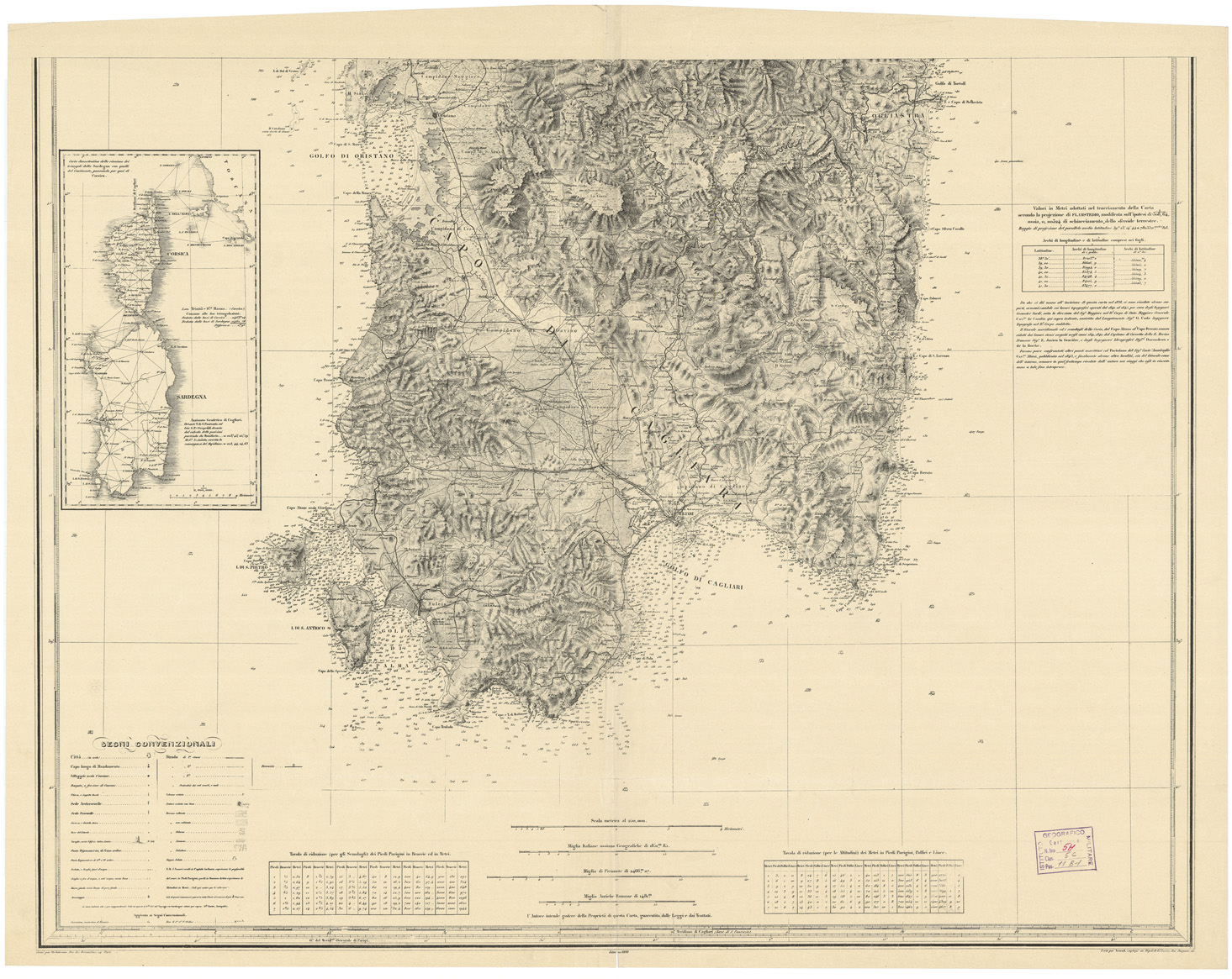 "Dedicata alla Maestà del Re Carlo Alberto Primo dal suo umilissimo e devotissimo suddito il Maggior Generale C.te Alberto Ferrero della Marmora, Comandante la Regia scuola di marina di Genova, Membro della R. Accademia delle Scienze di Torino già Colonnello -ajutante -Generale nel R. Corpo di Stato Maggiore Generale, assistito dal suo collaboratore * il cav. D. Carlo de Candia Maggiore nel R. Corpo suddetto. Incisa da Debuissons, Strada des bernardins, 24. Scritta da Arnoul impiegato al deposito della Guerra, addetto alla Carta di Francia_ Ibid. Paris e Torino, 1845. *Sui lavori trigonometrici e geodetici di questa carta incominciati nel 1824, e proseguiti quasi senza interruzioni sino al 1838, vedasi la notice inserita nel 1°vol 2 da Ediz (1839) del Voyage en sardaigne del medesimo autore. Parigi, presso Arthus Bertrand, strada Montefeuille, 23: e Chamerot, strada du jardinet, 13. La carta è una copia dell'edizione del 1898, la prima edizione è del 1845, effettuata nelle officine dell'Istituto Geografico Militare. Rispetto all'edizione del 1845 alcuni riquadri sono stati eliminati. Nel foglio sud: - Un riquadro con la "carta dimostrativa della riunione dei triangoli della Sardegna con quelli del Continente, passando per quei di Corsica", -in basso a sinistra la leggenda con i segni convenzionali e la Tavola di riduzione (per gli Scandagli) dei piedi parigini in Braccie ed in Metri, - in basso al centro quattro scale grafiche e numeriche, e l'avvertenza che " l'autore intende godere della Proprietà di questa carta, guarentita dalle Leggi e dai Trattati", -in basso a destra la Tavola di riduzione (per le Altitudini) dei metri in piedi Parigini, Pollici e Linee. - in alto a destra le informazioni sulla proiezione utilizzata e una tabella con i valori degli archi di longitudine e latitudine compresi nei fogli. Poi una lunga nota avverte sulle fonti utilizzate per la compilazione della carta."