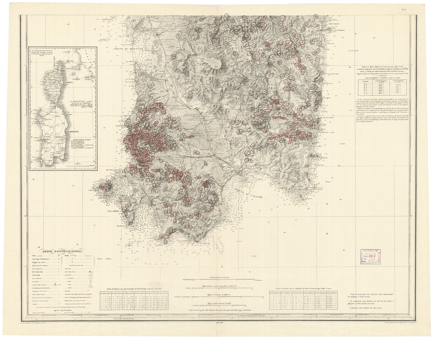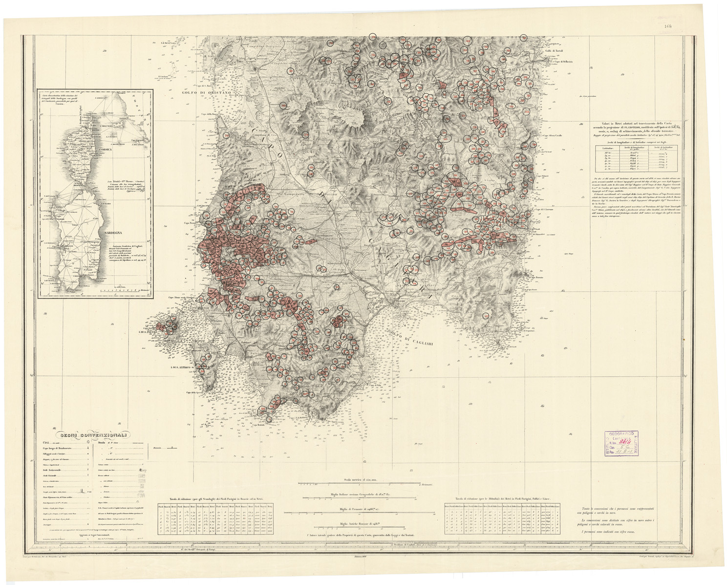"Dedicata alla Maestà del Re Carlo Alberto Primo dal suo umilissimo e devotissimo suddito il Maggior Generale C.te Alberto Ferrero della Marmora, Comandante la Regia scuola di marina di Genova, Membro della R. Accademia delle Scienze di Torino già Colonnello -ajutante -Generale nel R. Corpo di Stato Maggiore Generale, assistito dal suo collaboratore * il cav. D. Carlo de Candia Maggiore nel R. Corpo suddetto. Incisa da Debuissons, Strada des bernardins, 24. Scritta da Arnoul impiegato al deposito della Guerra, addetto alla Carta di Francia_ Ibid. Paris e Torino, 1845. *Sui lavori trigonometrici e geodetici di questa carta incominciati nel 1824, e proseguiti quasi senza interruzioni sino al 1838, vedasi la notice inserita nel 1°vol 2 da Ediz (1839) del Voyage en sardaigne del medesimo autore. Parigi, presso Arthus Bertrand, strada Montefeuille, 23: e Chamerot, strada du jardinet, 13. La carta è una copia dell'edizione del 1898, la prima edizione è del 1845, probabilmente effettuata nelle officine dell'Istituto Geografico Militare. In questa copia sono riportate le concessioni e i permessi numerate in nero e in rosso e individuate con cerchi e poligoni. Rispetto all'edizione del 1845 alcuni riquadri sono stati eliminati. Nel foglio sud: - Un riquadro con la "carta dimostrativa della riunione dei triangoli della Sardegna con quelli del Continente, passando per quei di Corsica", -in basso a sinistra la leggenda con i segni convenzionali e la Tavola di riduzione (per gli Scandagli) dei piedi parigini in Braccie ed in Metri, - in basso al centro quattro scale grafiche e numeriche, e l'avvertenza che " l'autore intende godere della Proprietà di questa carta, guarentita dalle Leggi e dai Trattati", -in basso a destra la Tavola di riduzione (per le Altitudini) dei metri in piedi Parigini, Pollici e Linee. Accanto la dicitura " Tanto le concessioni che i permessi sono rappresentati con poligoni e cerchi in nero. Le concessioni sono distinte con cifre in nero entro i poligoni o cerchi colorati in rosso. I permessi sono indicati con cifre rosse." - in alto a destra le informazioni sulla proiezione utilizzata e una tabella con i valori degli archi di longitudine e latitudine compresi nei fogli. Poi una lunga nota avverte sulle fonti utilizzate per la compilazione della carta."