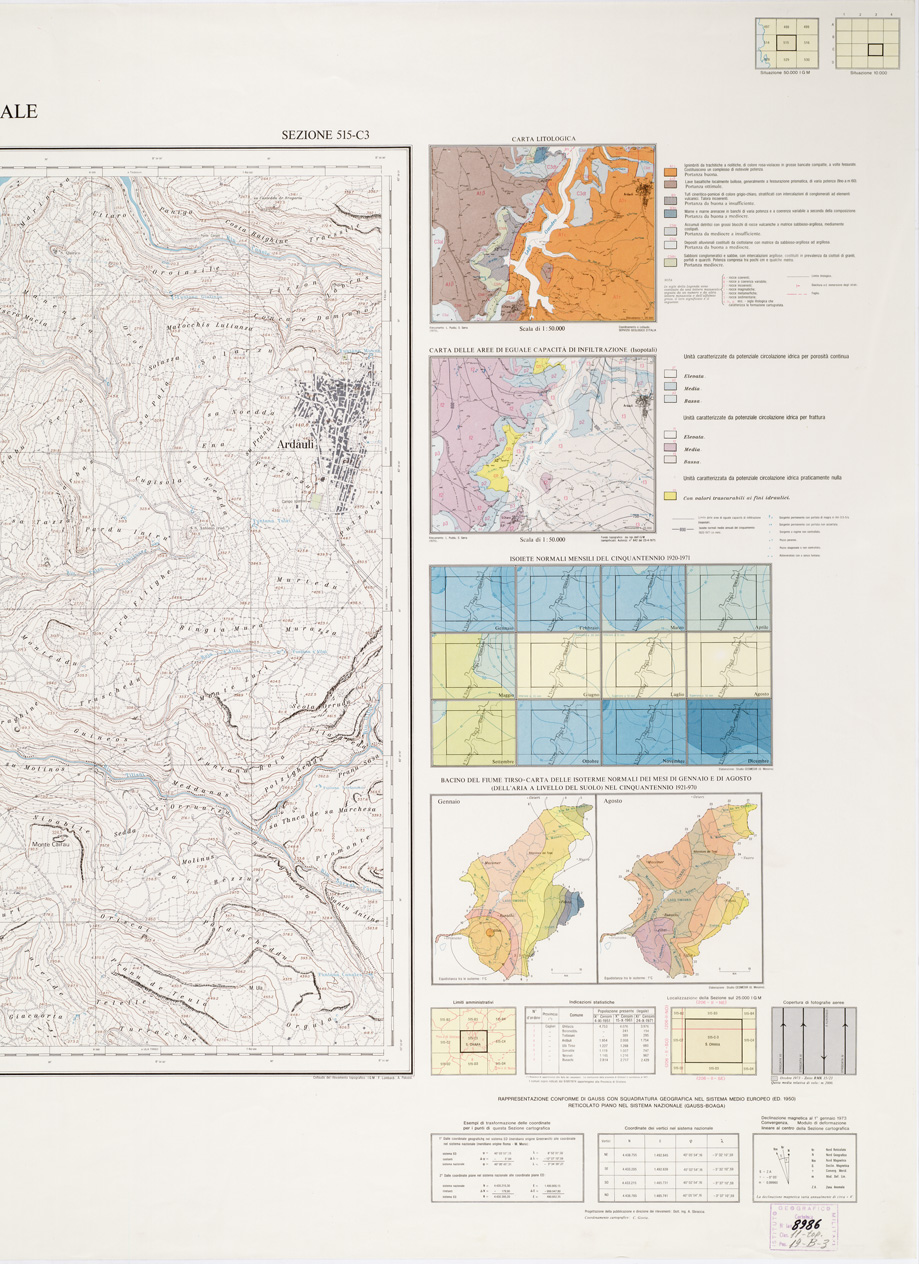"Rappresentazione orografica a curve di livello, l'equidistanza fra le curve di livello: metri 10 per le curve a tratti metri 2. Altimetria espressa in metri e riferita al livello medio del mare (mareografo di Cagliari). Ripresa aerea, inquadramento geodetico e triangolazione aerea: I.G.M. restituzione aereofotogrammetrica, ricognizione e disegno: Geografica s.a.s. (FI). Impianto cromo-fotolitografico: Studio 3 (FI). Stampa: Pubbligraf, Napoli."