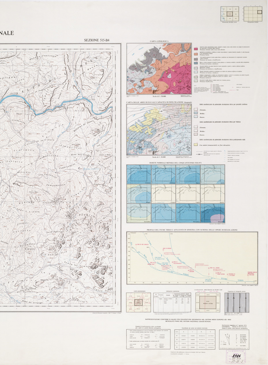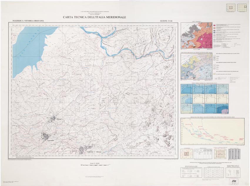"Rappresentazione orografica a curve di livello, l'equidistanza fra le curve di livello: metri 10 per le curve a tratti metri 2. Altimetria espressa in metri e riferita al livello medio del mare (mareografo di Cagliari). Ripresa aerea, inquadramento geodetico e triangolazione aerea: I.G.M. restituzione aereofotogrammetrica, ricognizione e disegno: Geografica s.a.s. (FI). Impianto cromo-fotolitografico: Studio 3 (FI). Stampa: Pubbligraf, Napoli."