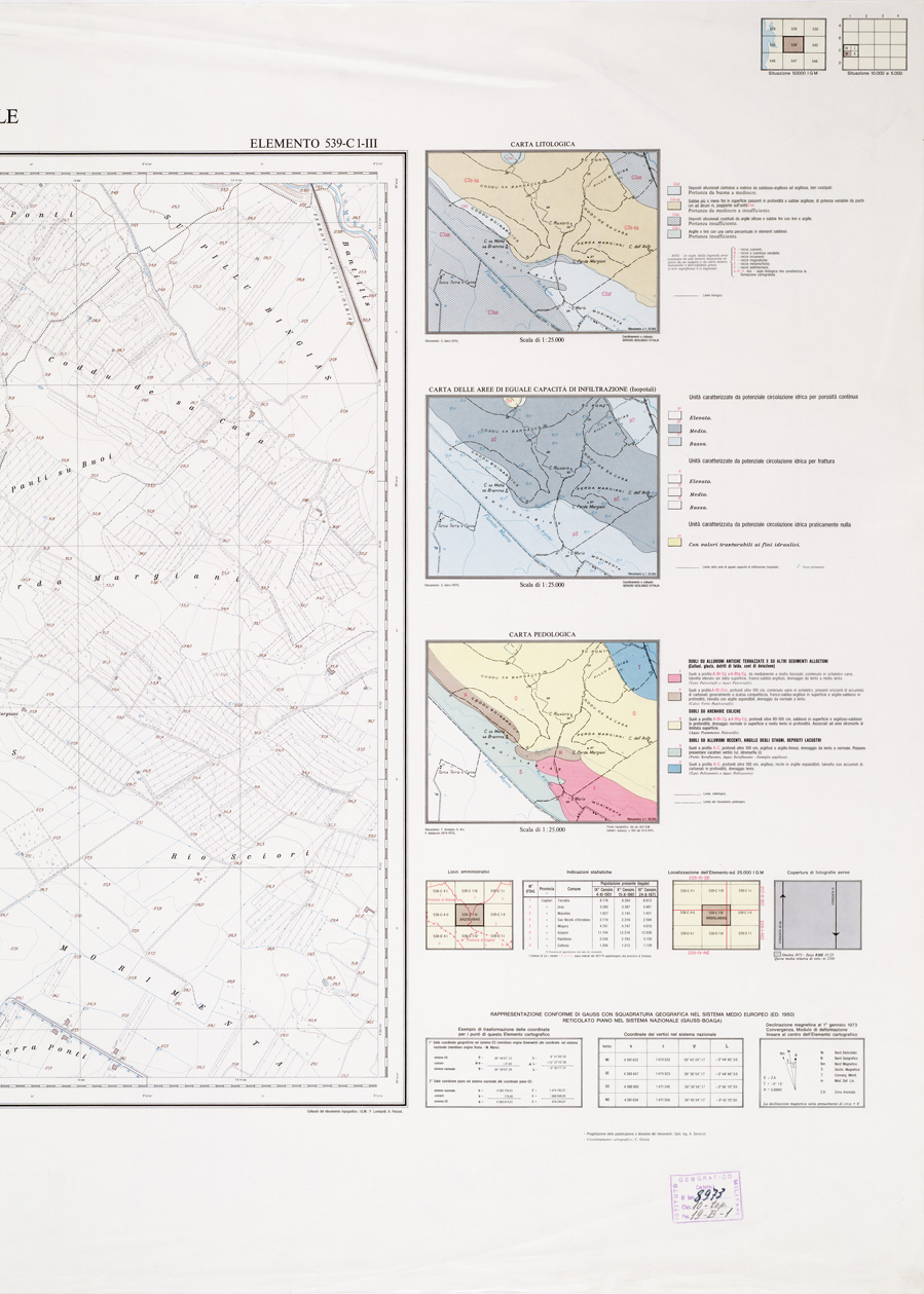 "Rappresentazione orografica a curve di livello, l'equidistanza fra le curve di livello: metri 5 per le curve a tratti metri 1. Altimetria espressa in metri e riferita al livello medio del mare (mareografo di Cagliari). Ripresa aerea, inquadramento geodetico e triangolazione aerea: I.G.M. restituzione aereofotogrammetrica, ricognizione e disegno: Impresa I. Benedetti(FI). Impianto cromo-fotolitografico: Ordis, Piacenza. Stampa: Pubbligraf, Napoli."