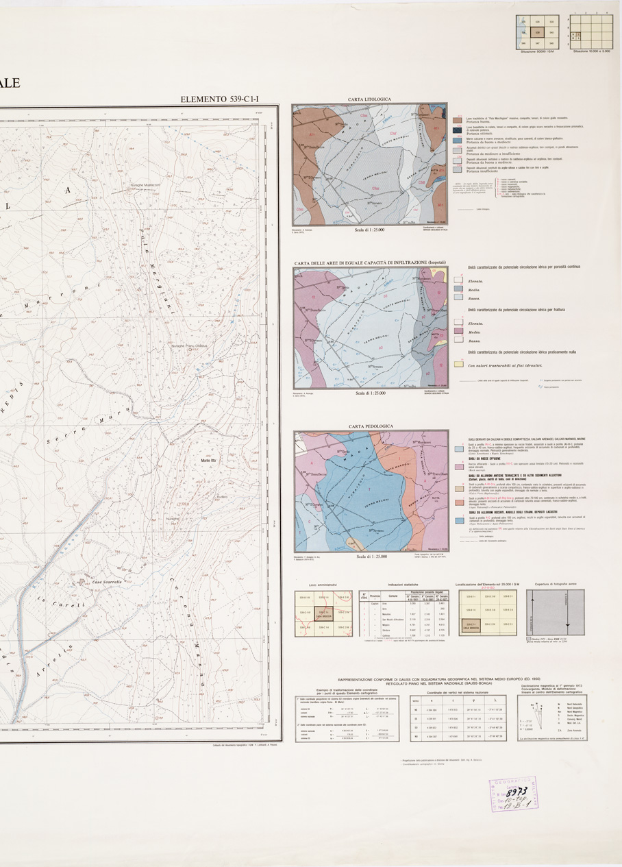 "Rappresentazione orografica a curve di livello, l'equidistanza fra le curve di livello: metri 5 per le curve a tratti metri 1. Altimetria espressa in metri e riferita al livello medio del mare (mareografo di Cagliari). Ripresa aerea, inquadramento geodetico e triangolazione aerea: I.G.M. restituzione aereofotogrammetrica, ricognizione e disegno: Impresa I. Benedetti(FI). Impianto cromo-fotolitografico: Ordis, Piacenza. Stampa: Pubbligraf, Napoli."