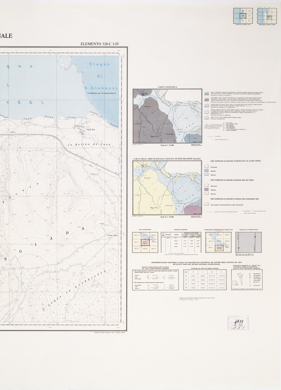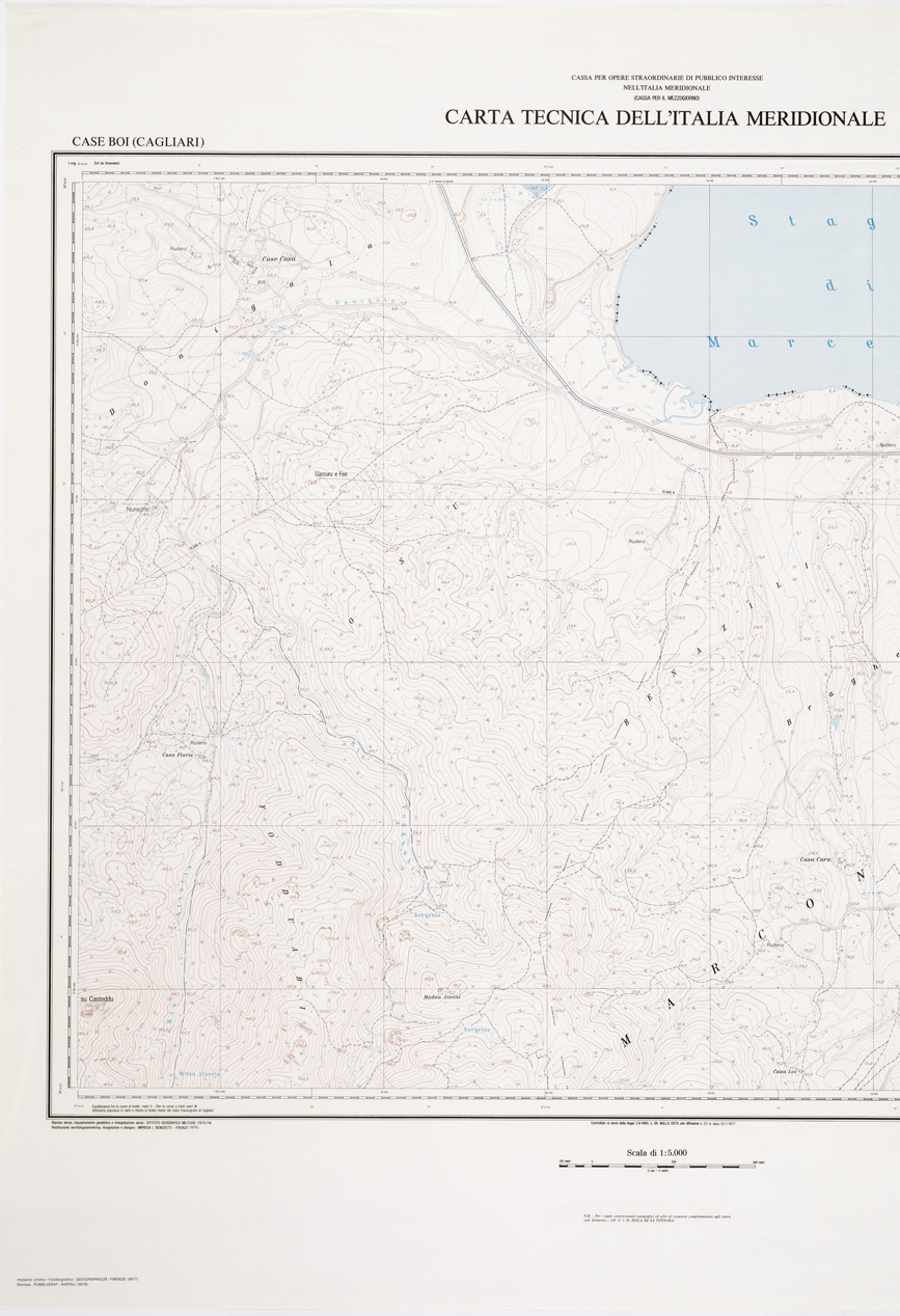 "Rappresentazione orografica a curve di livello, l'equidistanza fra le curve di livello: metri 5 per le curve a tratti metri 1. Altimetria espressa in metri e riferita al livello medio del mare (mareografo di Cagliari). Ripresa aerea, inquadramento geodetico e triangolazione aerea: I.G.M. restituzione aereofotogrammetrica, ricognizione e disegno: Impresa I. Benedetti(FI). Impianto cromo-fotolitografico: Geographicus(FI). Stampa: Pubbligraf, Napoli."