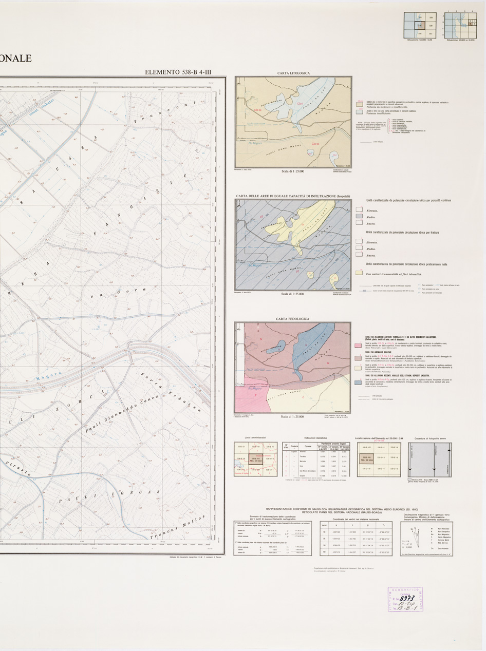 "Rappresentazione orografica a curve di livello, l'equidistanza fra le curve di livello: metri 5 per le curve a tratti metri 1. Altimetria espressa in metri e riferita al livello medio del mare (mareografo di Cagliari). Ripresa aerea, inquadramento geodetico e triangolazione aerea: I.G.M. restituzione aereofotogrammetrica, ricognizione e disegno: Impresa I. Benedetti (FI). Impianto cromo-fotolitografico: Geographicus (FI). Stampa: Pubbligraf, Napoli."