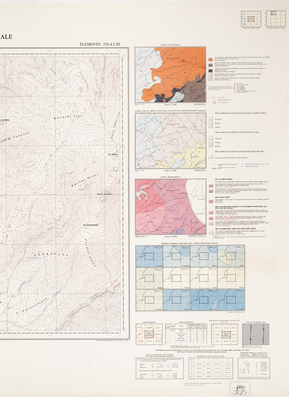 "Rappresentazione orografica a curve di livello, l'equidistanza fra le curve di livello: metri 5 per le curve a tratti metri 1. Altimetria espressa in metri e riferita al livello medio del mare (mareografo di Cagliari). Ripresa aerea, inquadramento geodetico e triangolazione aerea: I.G.M. restituzione aereofotogrammetrica, ricognizione e disegno: Geografica s.a.s. (FI). Impianto fotolitografico: Studio 3 (FI). Stampa: Pubbligraf, Napoli."